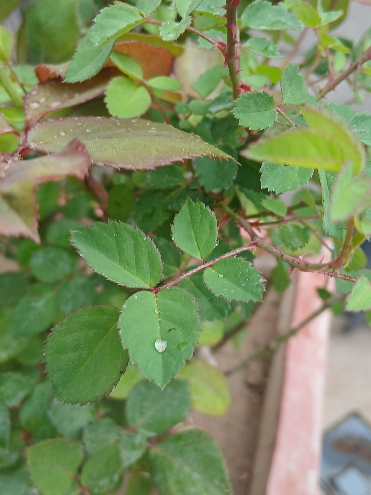 The image shows a close-up view of a rose bush in Quetta City Tehsil, Pakistan. The focus is on the leaves and stems, which are green and red respectively. There are small thorns visible on the stems.…read more