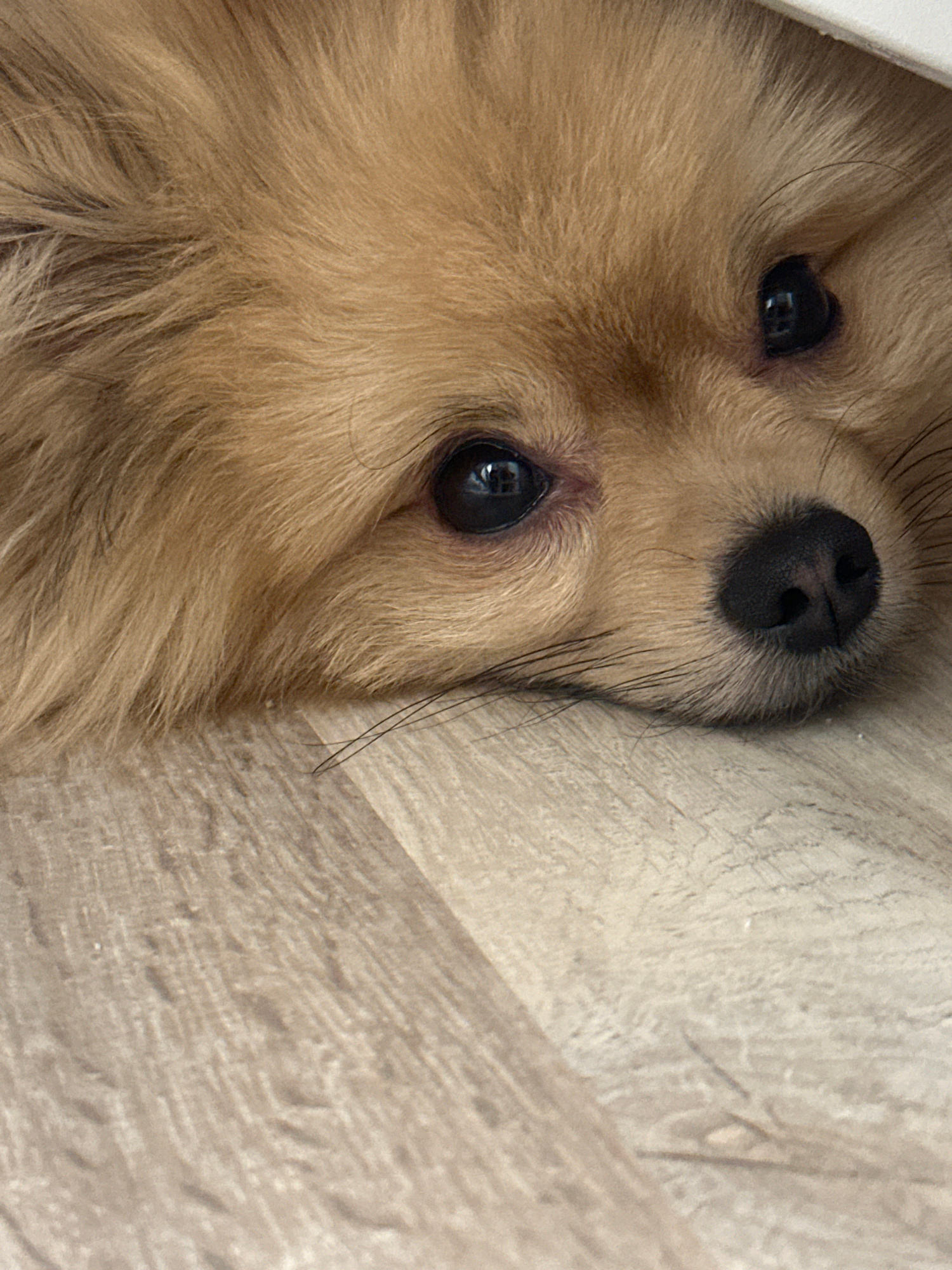 A close-up, intimate shot captures the face of a fluffy, light brown or cream-colored dog, likely a small breed like a Pomeranian. The dog's head is angled, creating an impression of it peeking out or…read more
