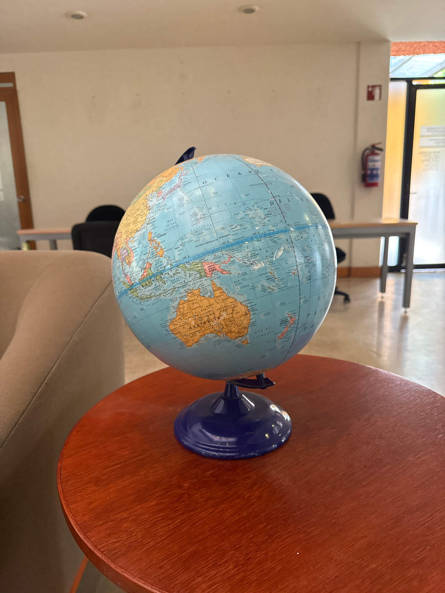 The image shows a globe resting on a round, wooden table. The globe is light blue with visible continents and oceans. The base of the globe is dark blue. The table is a reddish-brown color with a smoo…read more