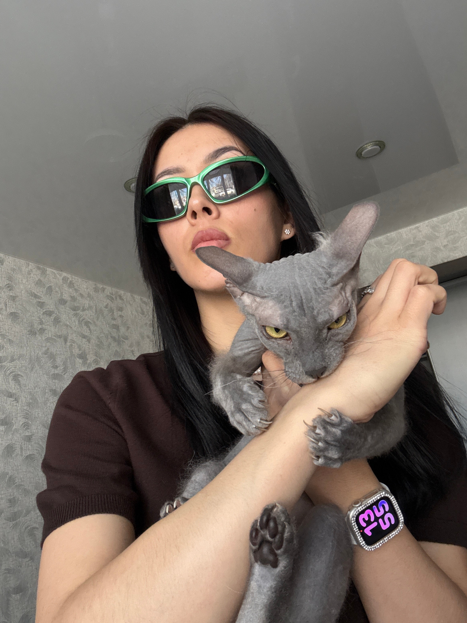 A woman with long, dark hair and green-framed sunglasses is holding a gray, hairless cat. The woman wears a dark brown sweater and a silver smartwatch with a sparkly bezel. The cat has yellow eyes and…read more
