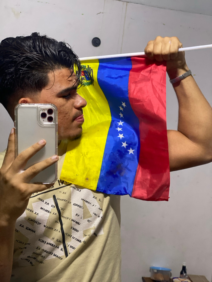 A person lies down, holding a smartphone and a Venezuelan flag. The flag is red, blue, and yellow with seven stars in the blue stripe. The person is wearing a light brown t-shirt with a repetitive pat…read more