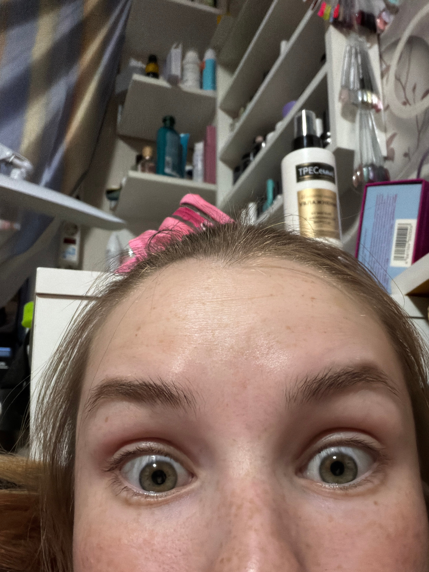 The image is a close-up, slightly angled view of a person's face, primarily focusing on the eyes and forehead. The person has fair skin with visible freckles. Their eyes are hazel-colored with dark pu…read more