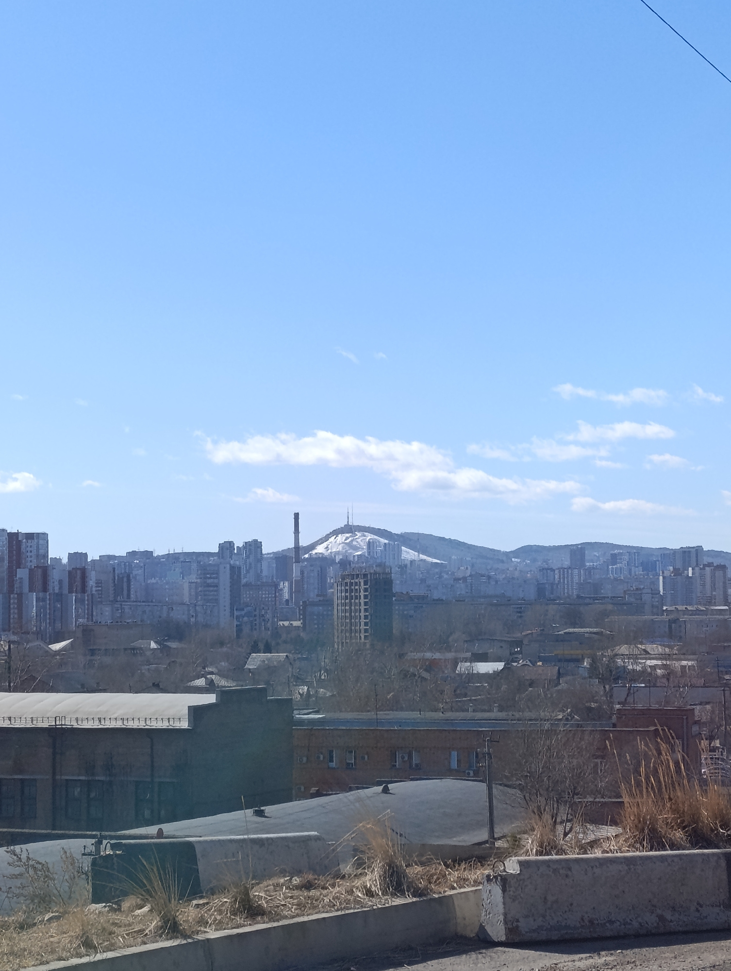 The image presents a daytime cityscape of Krasnoyarsk, Russia. The foreground features concrete barriers and dry vegetation. Mid-ground shows industrial buildings and low-rise structures interspersed…read more