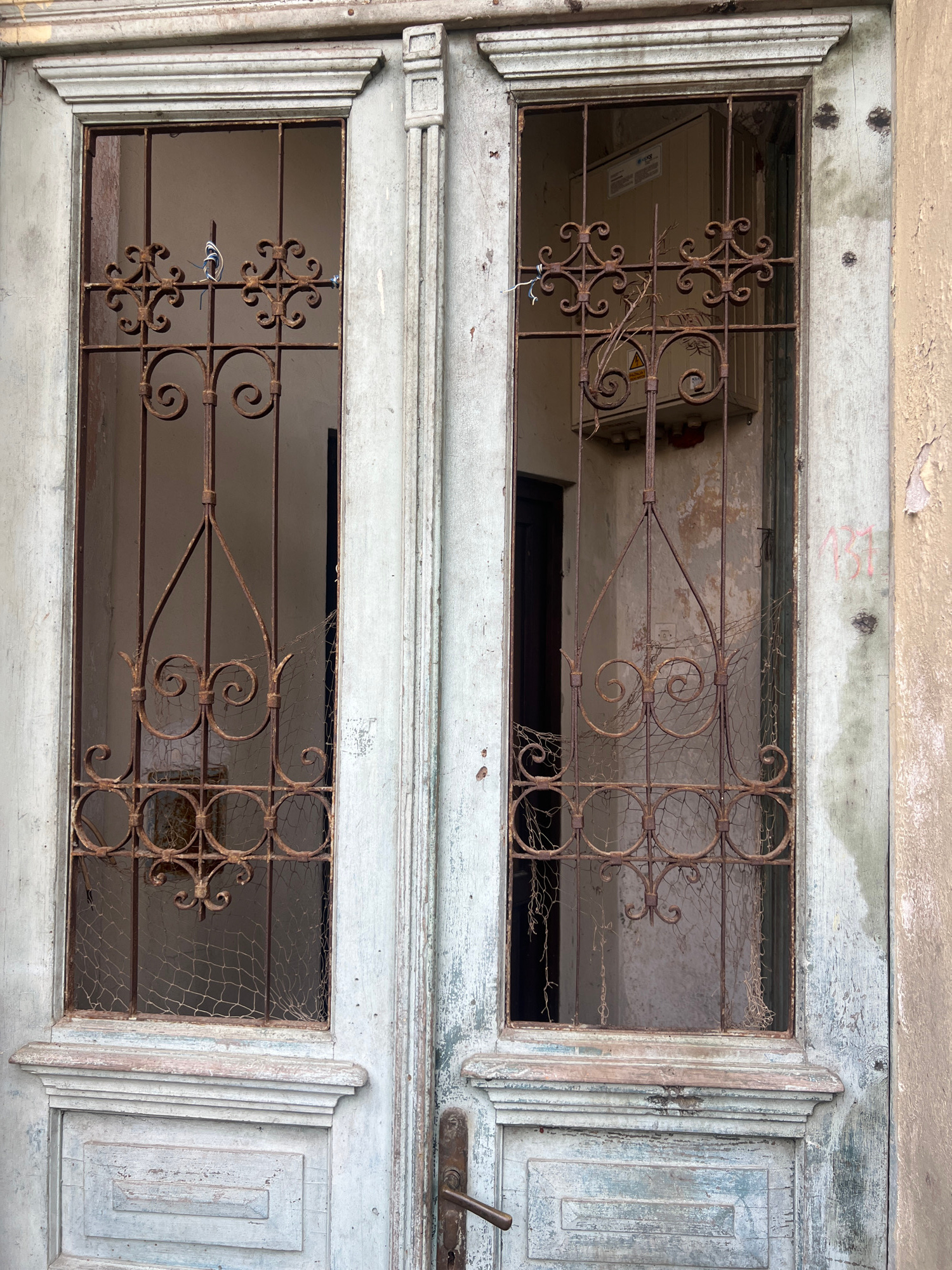 The image depicts an old, weathered double door, possibly an entrance to a building, in Cetinje, Montenegro. The door is painted a pale blue-grey, with chipping and peeling paint exposing the wood und…read more