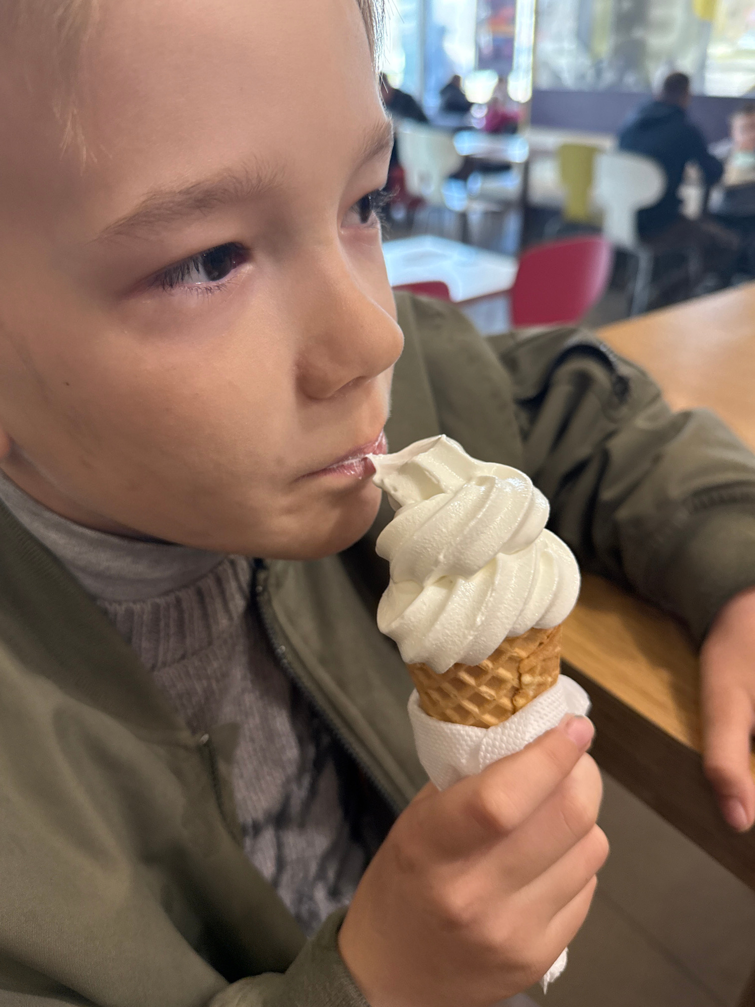 A close-up shot depicts a fair-skinned child eating a cone of soft-serve ice cream. The child, wearing a gray knit sweater and an olive-green jacket, holds the ice cream cone, which is wrapped in a wh…read more