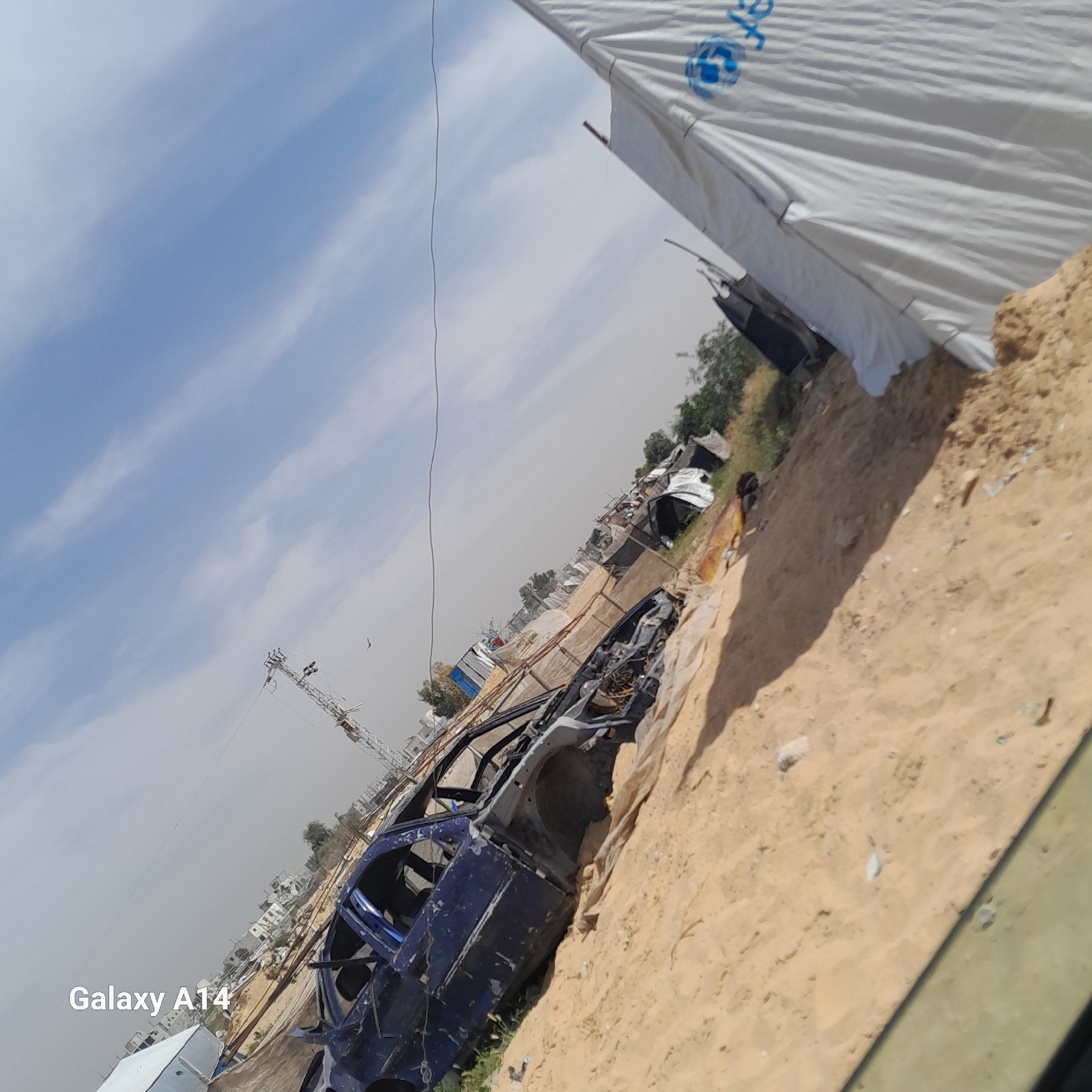 The image shows a destroyed vehicle frame, possibly of a car, among debris in what appears to be an outdoor setting in Khan Yunis, Palestinian Territory. The vehicle is blue and heavily damaged, sugge…read more