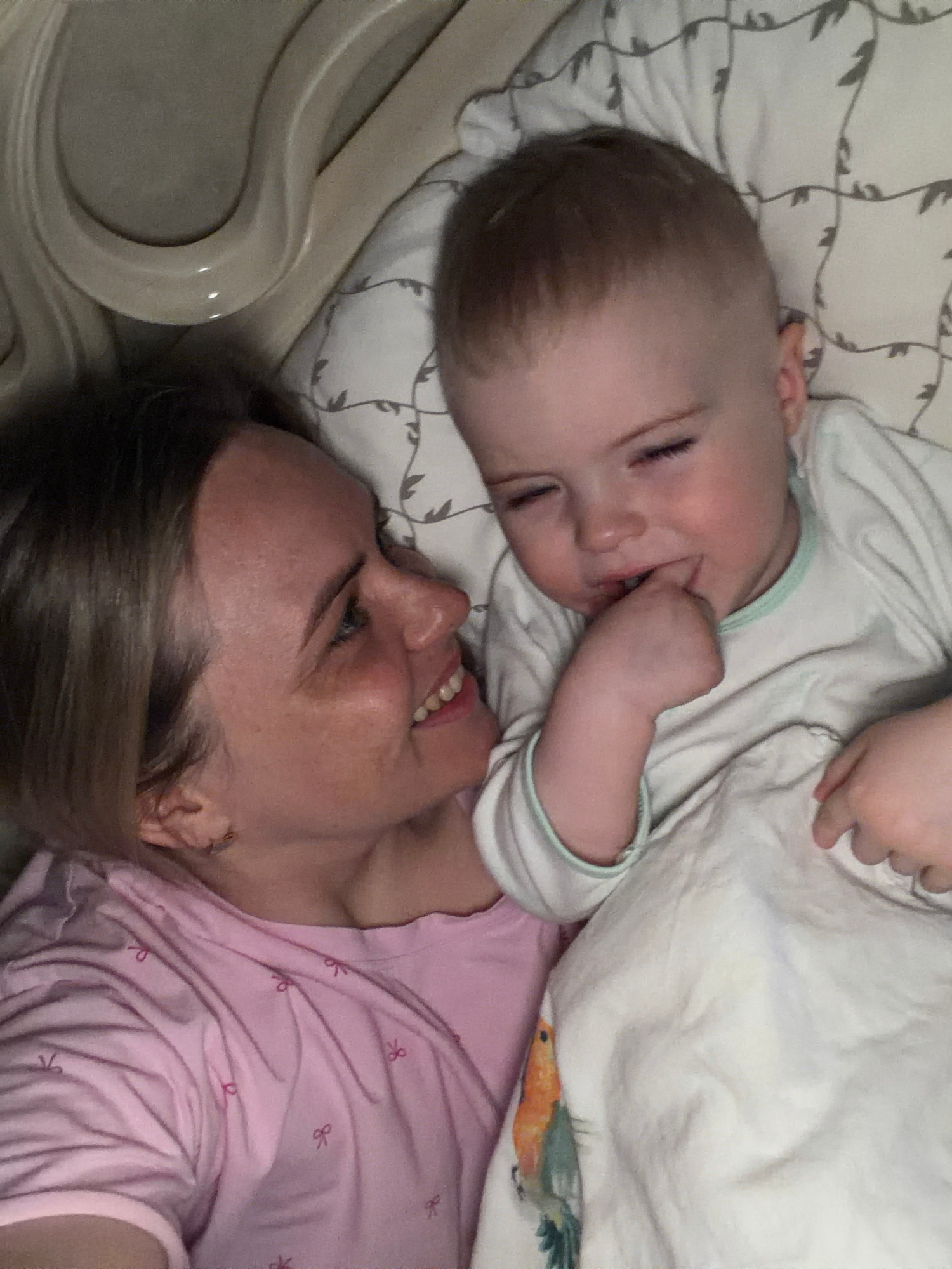 A woman and a baby lie on a patterned bed in an indoor setting. The baby, wearing a white onesie with a light blue trim, has their hand near their mouth. The woman, wearing a pink top, is smiling and…read more