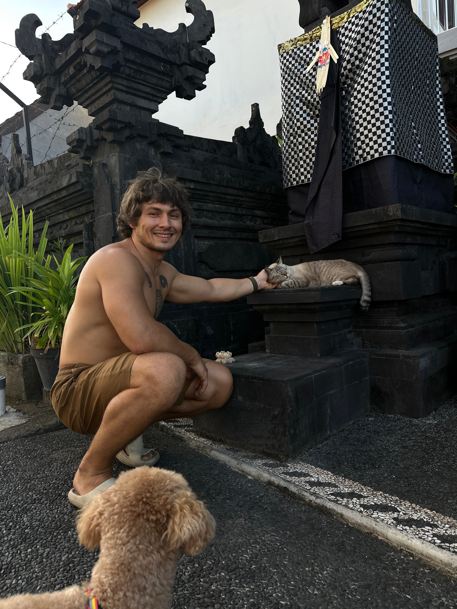 In an outdoor scene in North Kuta, Indonesia, a shirtless man with brown hair is kneeling next to a small dog, holding a grey tabby cat by its front paws above his head. The man is wearing tan shorts…read more