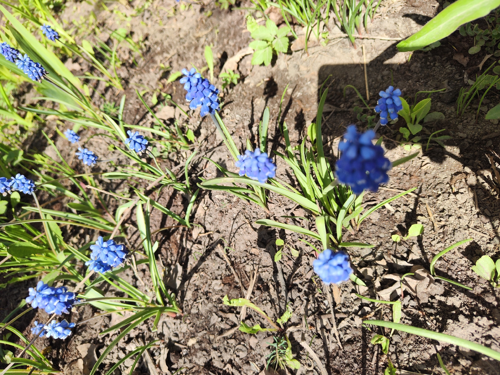 This media file captures a close-up, high-angle view of several clusters of blue Muscari flowers, commonly known as grape hyacinths, blooming in soil. The flowers are small, bell-shaped, and arranged…read more
