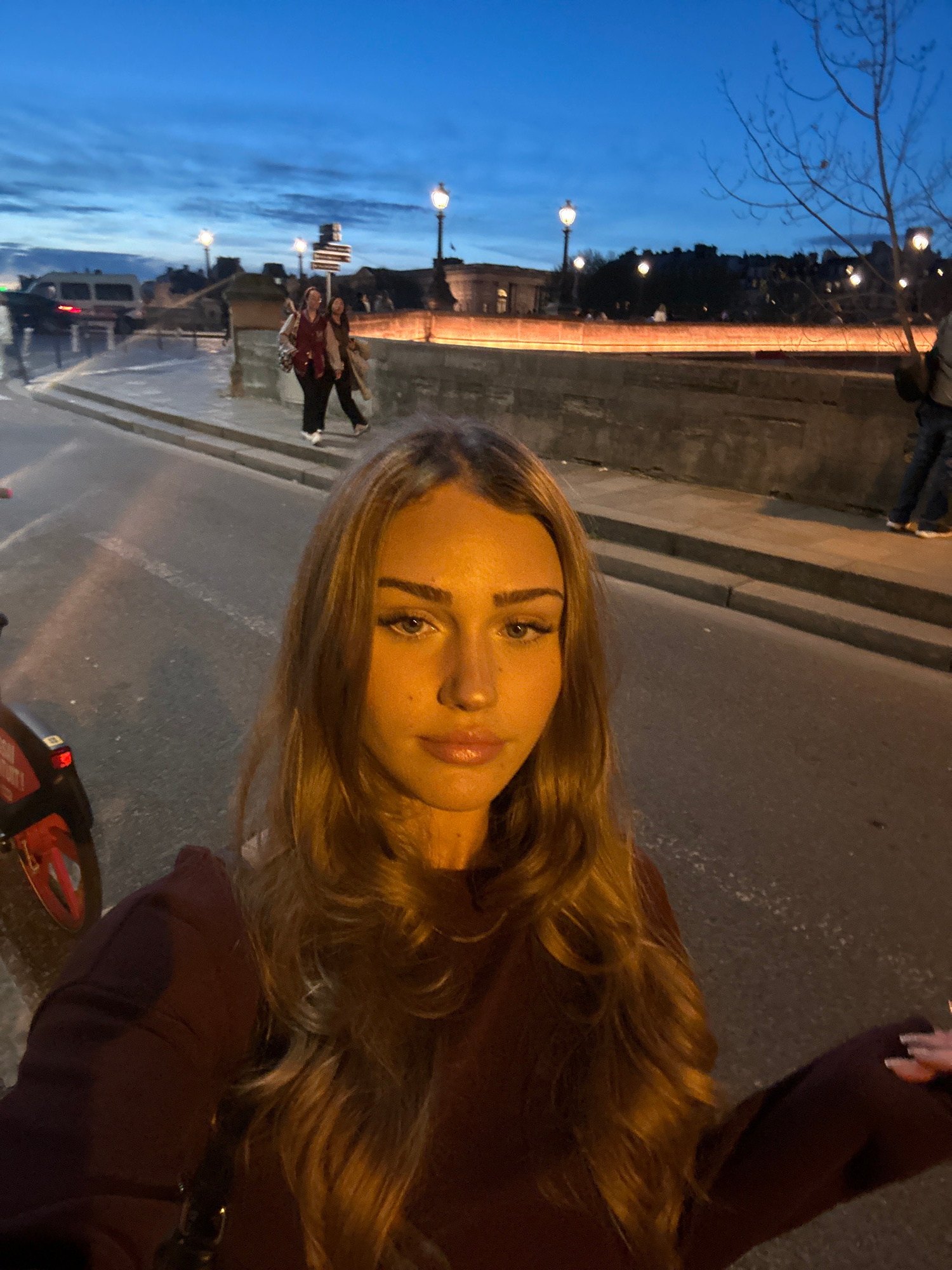 A woman with blonde hair and a maroon sweater is taking a selfie on a street in Paris at night. The Seine River is visible in the background with a bridge and street lamps. There are people walking on…read more