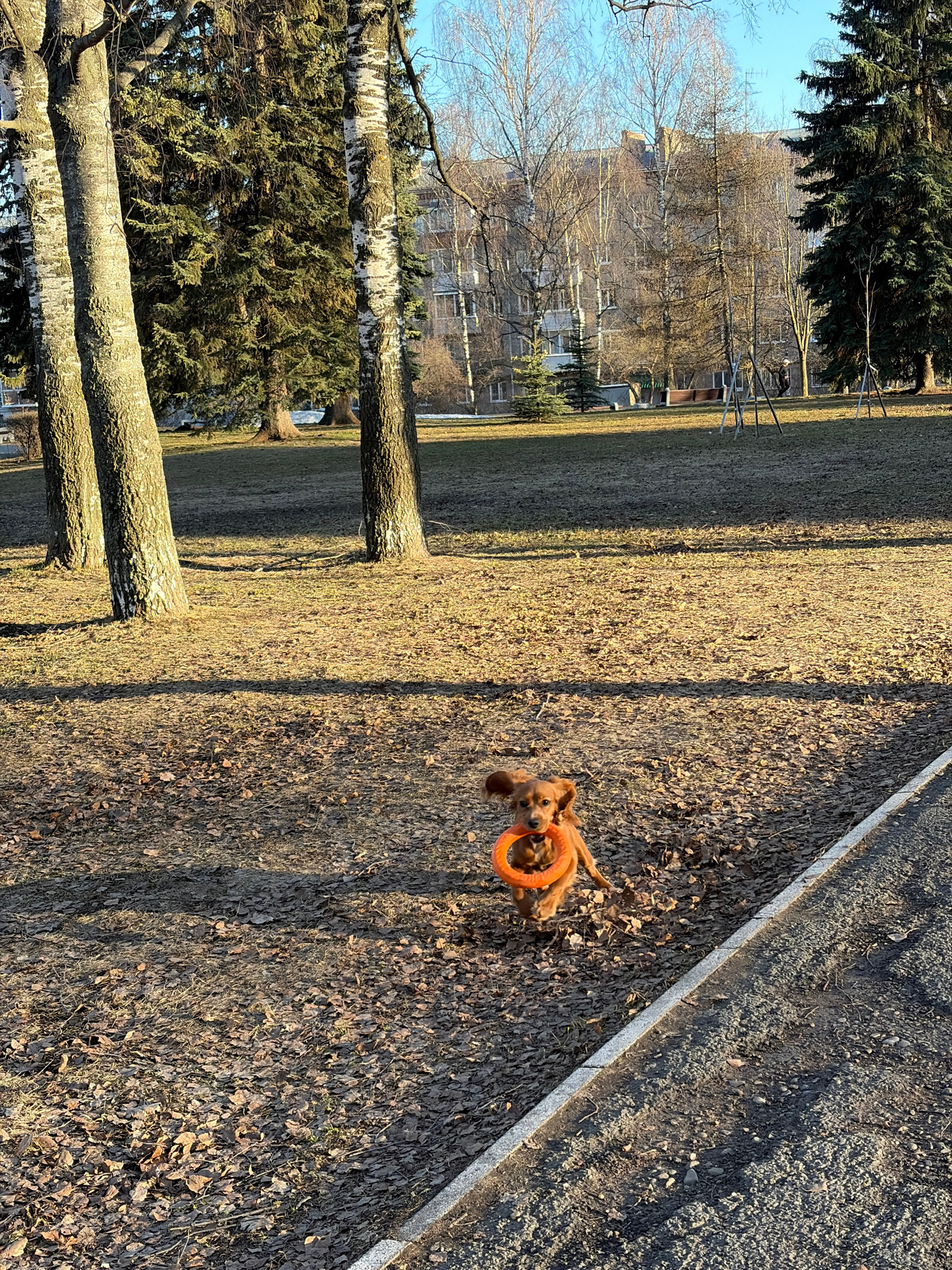 A medium-sized, brown dog is holding an orange circular toy in its mouth. It stands on a grassy area covered with fallen leaves near a sidewalk. In the background are trees and buildings, indicating a…read more