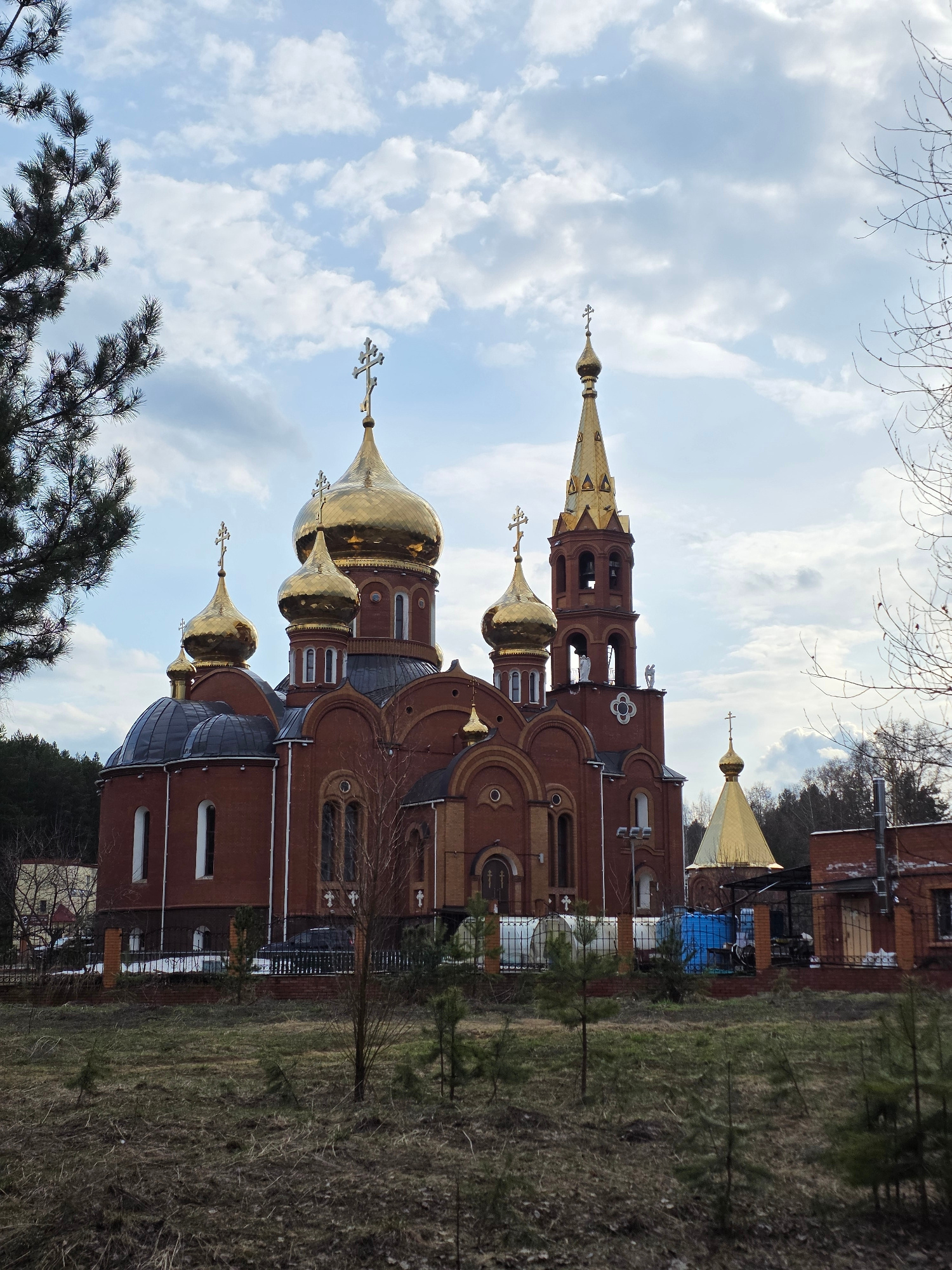 The image shows the Church of St. George the Victorious, located in Chaikovsky, Russia. The church is constructed of red brick and features multiple golden domes with crosses. The surrounding environm…read more