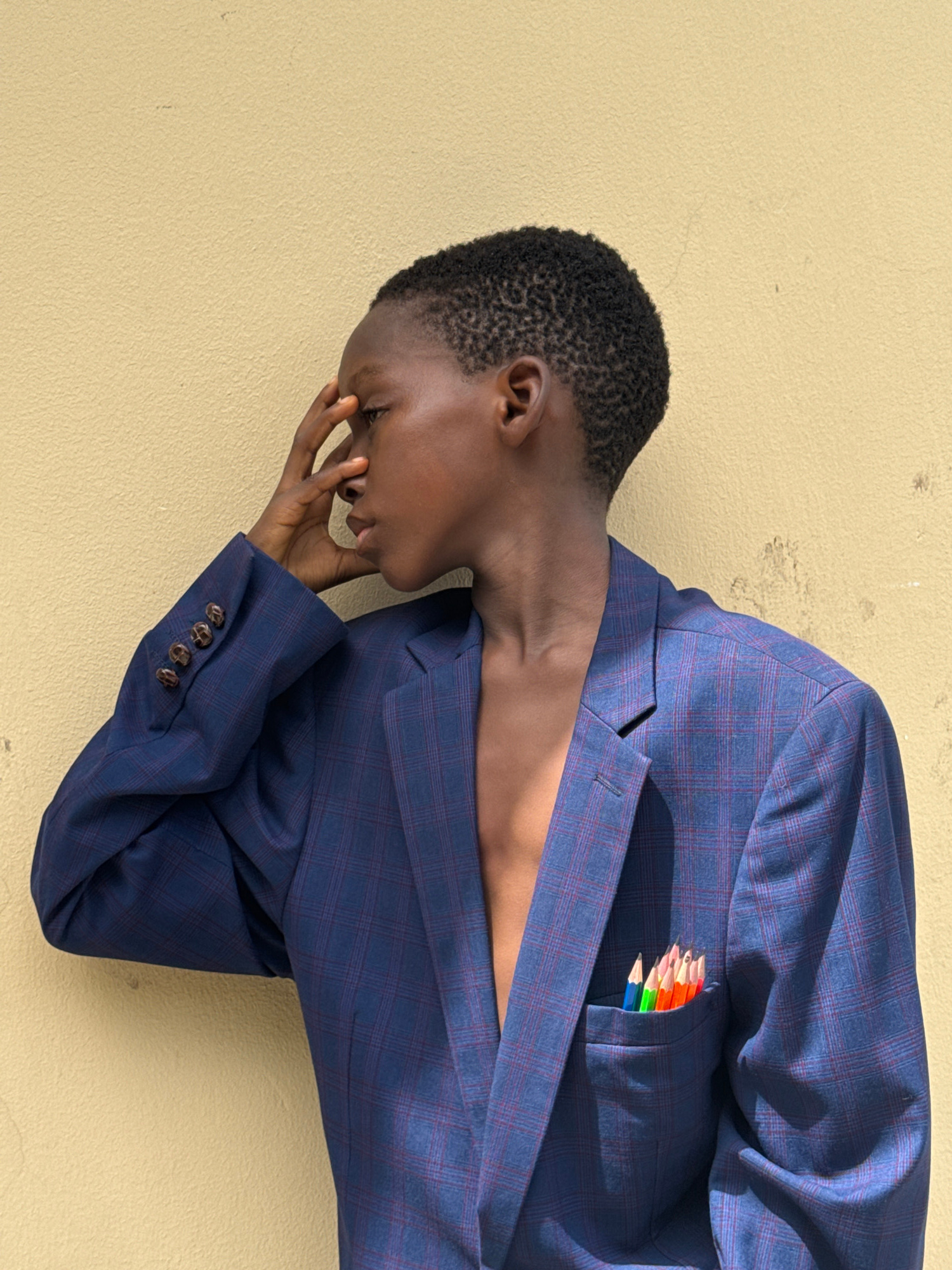 The image shows a dark-skinned person wearing a blue plaid suit jacket, with the jacket resting on a textured yellow surface, perhaps a wall. The person's head is turned and tilted downward, with theiβ¦read more