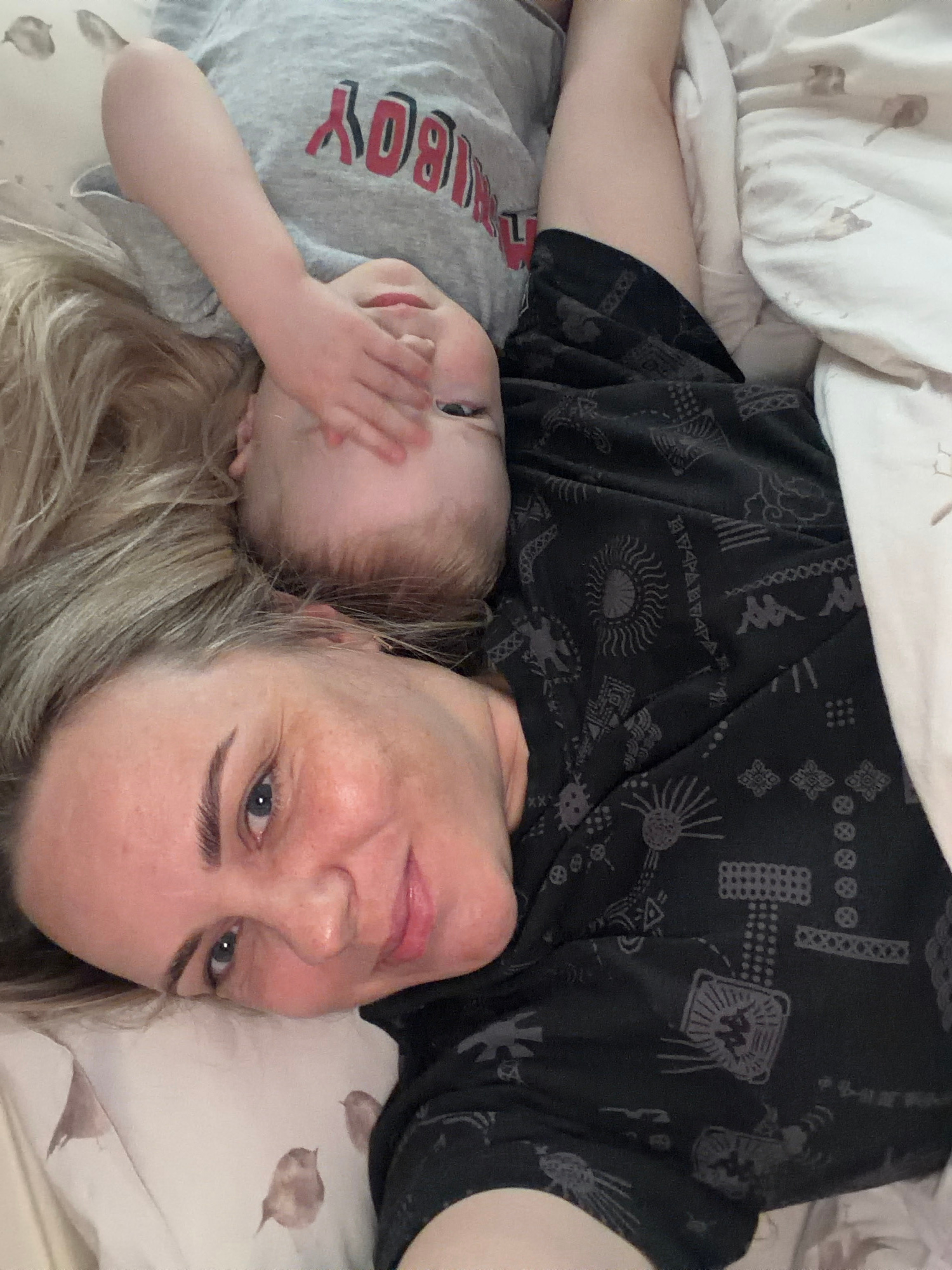 The image presents an intimate, overhead view of an adult woman and a young child lying together, likely in a bed. The scene suggests a relaxed, indoor moment, potentially in Votkinsk, Russia, as per…read more