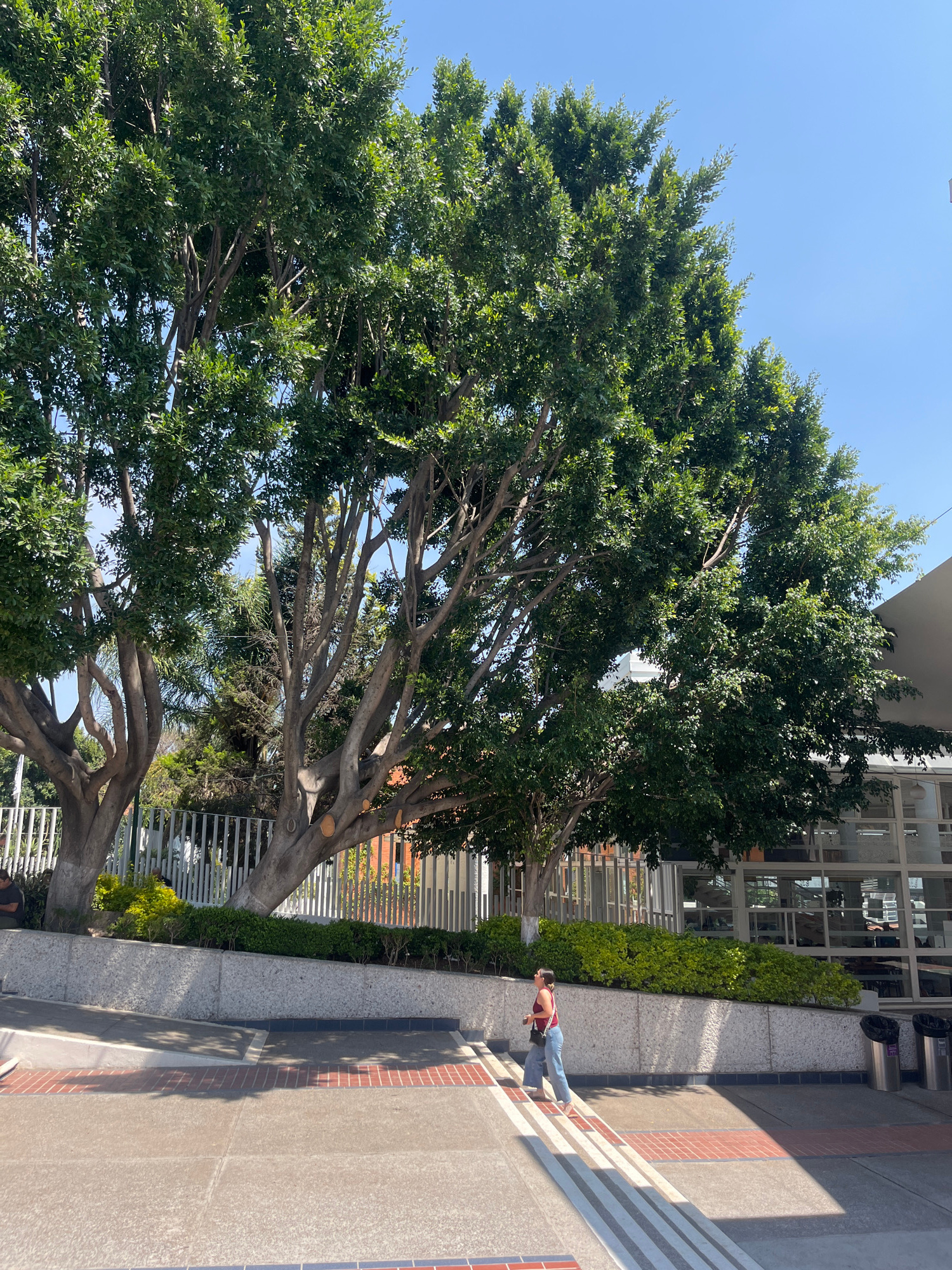 The image shows a large, leafy tree shading a sidewalk in Puebla, Mexico. A person wearing a red tank top and jeans is walking along the sidewalk. The sidewalk is made of concrete with brick accents.…read more