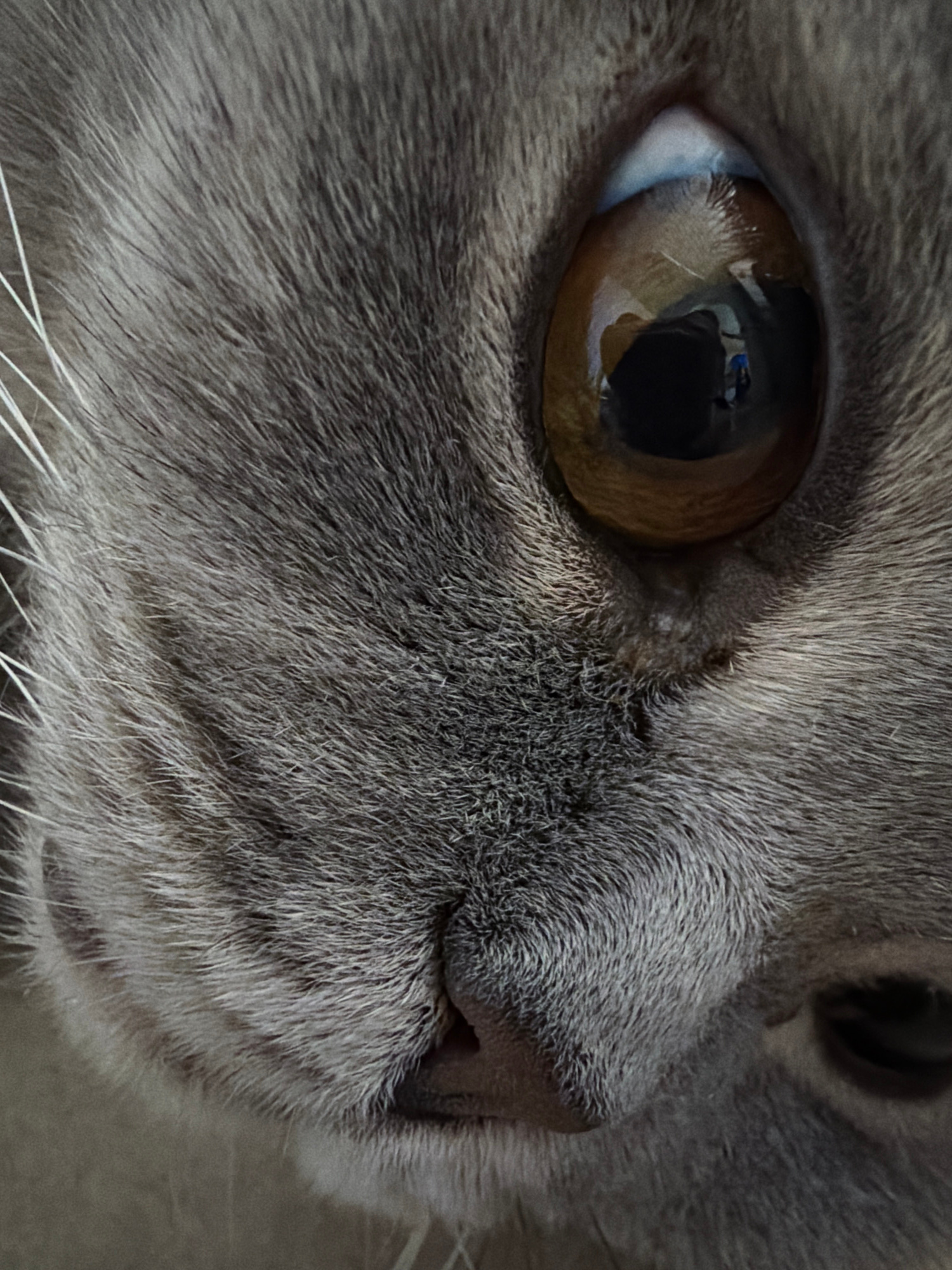 The image is a close-up of a gray cat's face. The cat has a large, round, amber-colored eye with a visible reflection. The cat's nose is pink and slightly wet, surrounded by gray fur. White whiskers a…read more