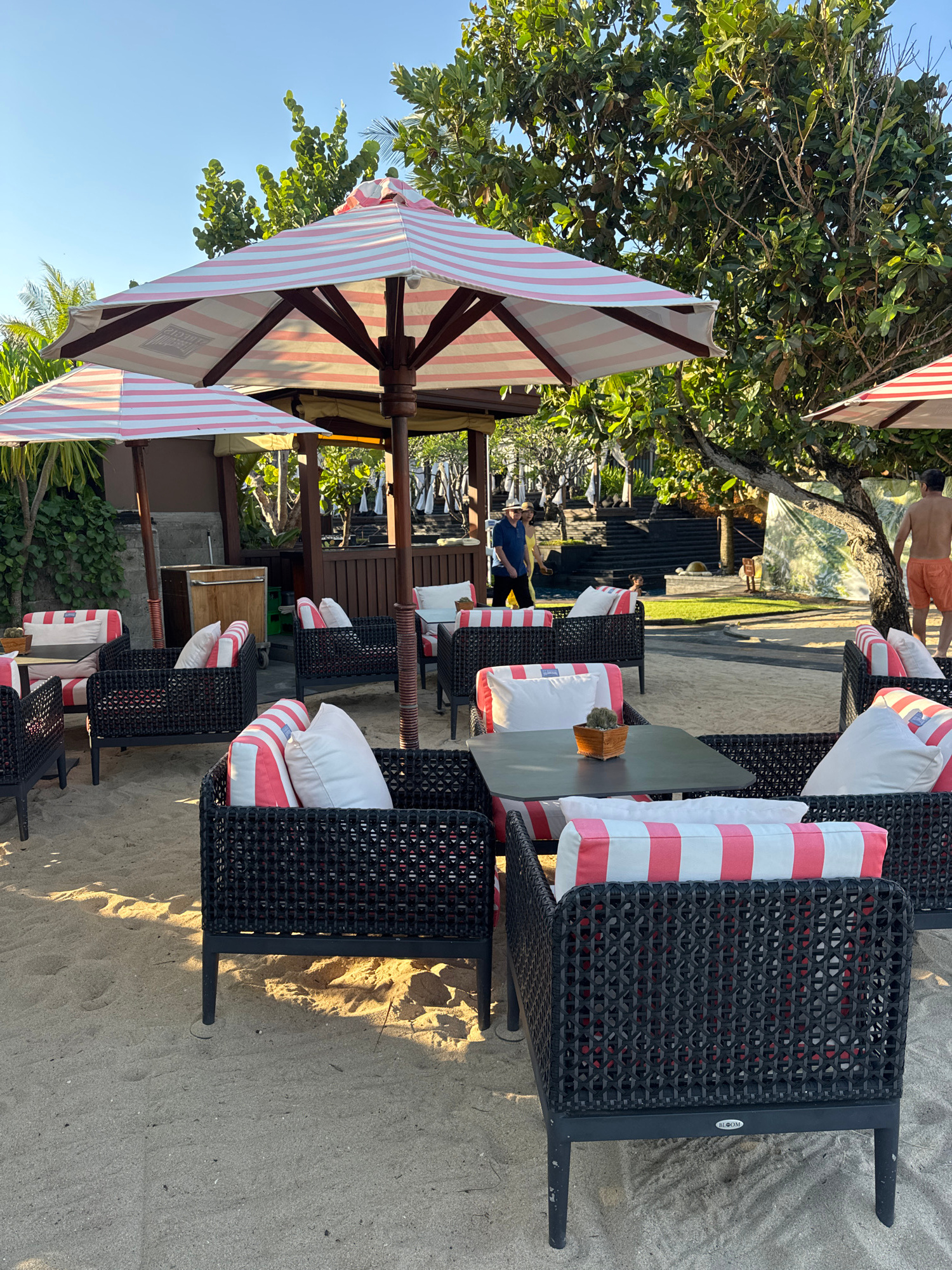 The image shows a beach scene in an unidentified location in Indonesia. The focal point is a set of black rattan chairs with red and white striped cushions and white pillows, arranged near small table…read more