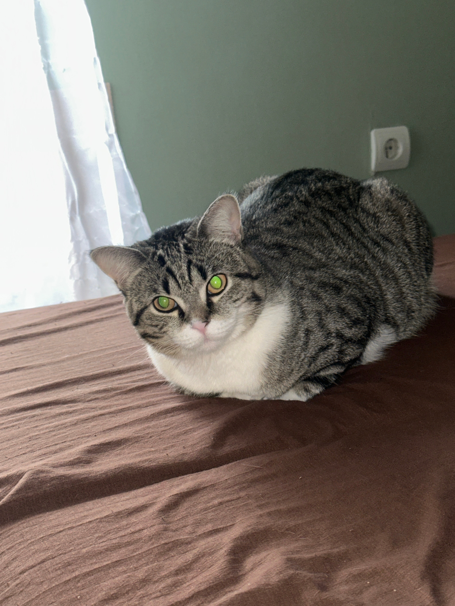 A domestic cat with gray tabby fur and white markings on its chest and face is oriented with its head towards the lower left corner of the image. The cat has green eyes and is looking up at the cameraβ¦read more