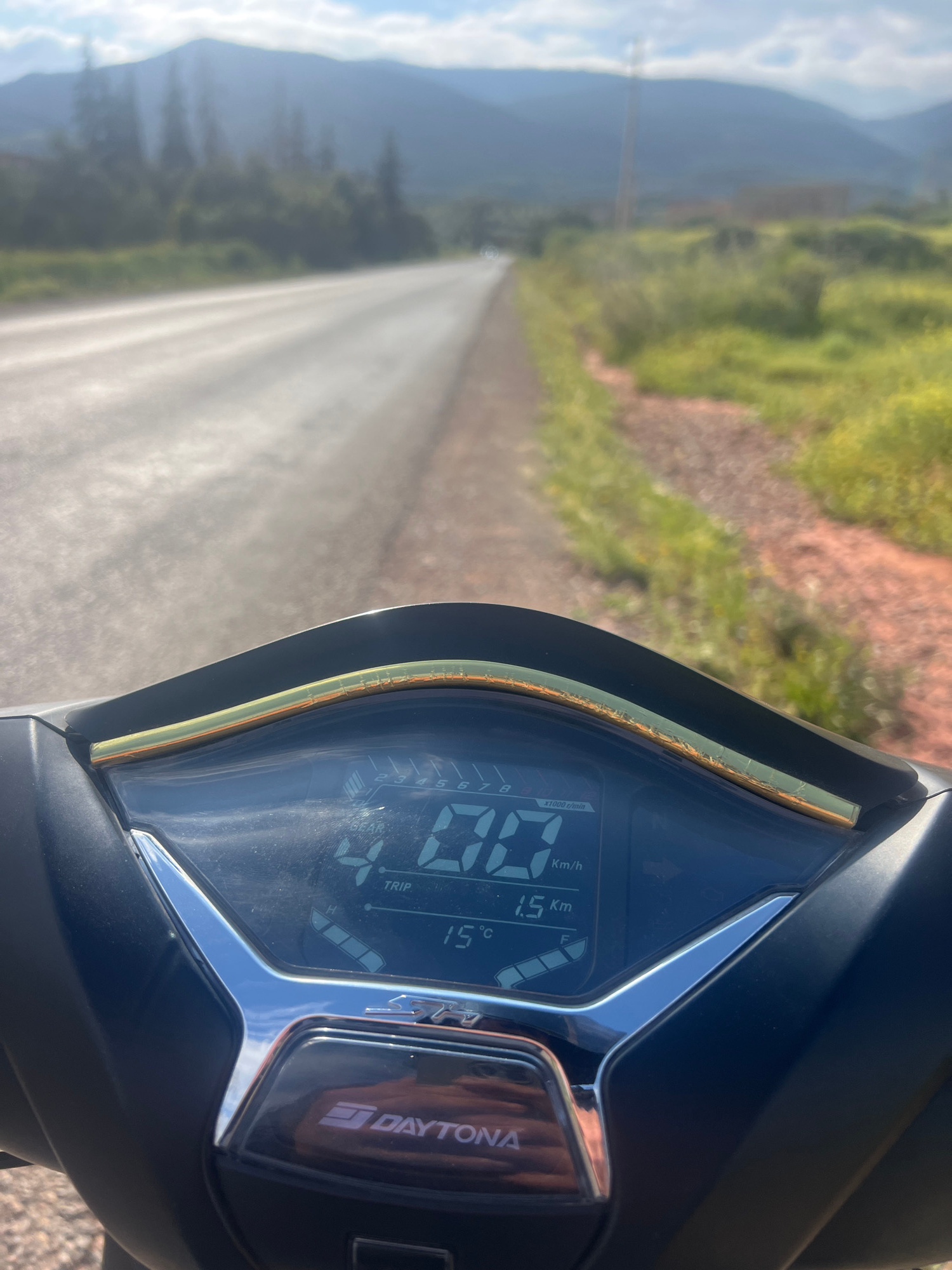 The image captures a view from a moving Daytona scooter on a road outside Ouaouizert, Morocco. The scooter's digital dashboard shows a speed of "00 Km/h," a trip distance of "1.5 Km," and a temperatur…read more