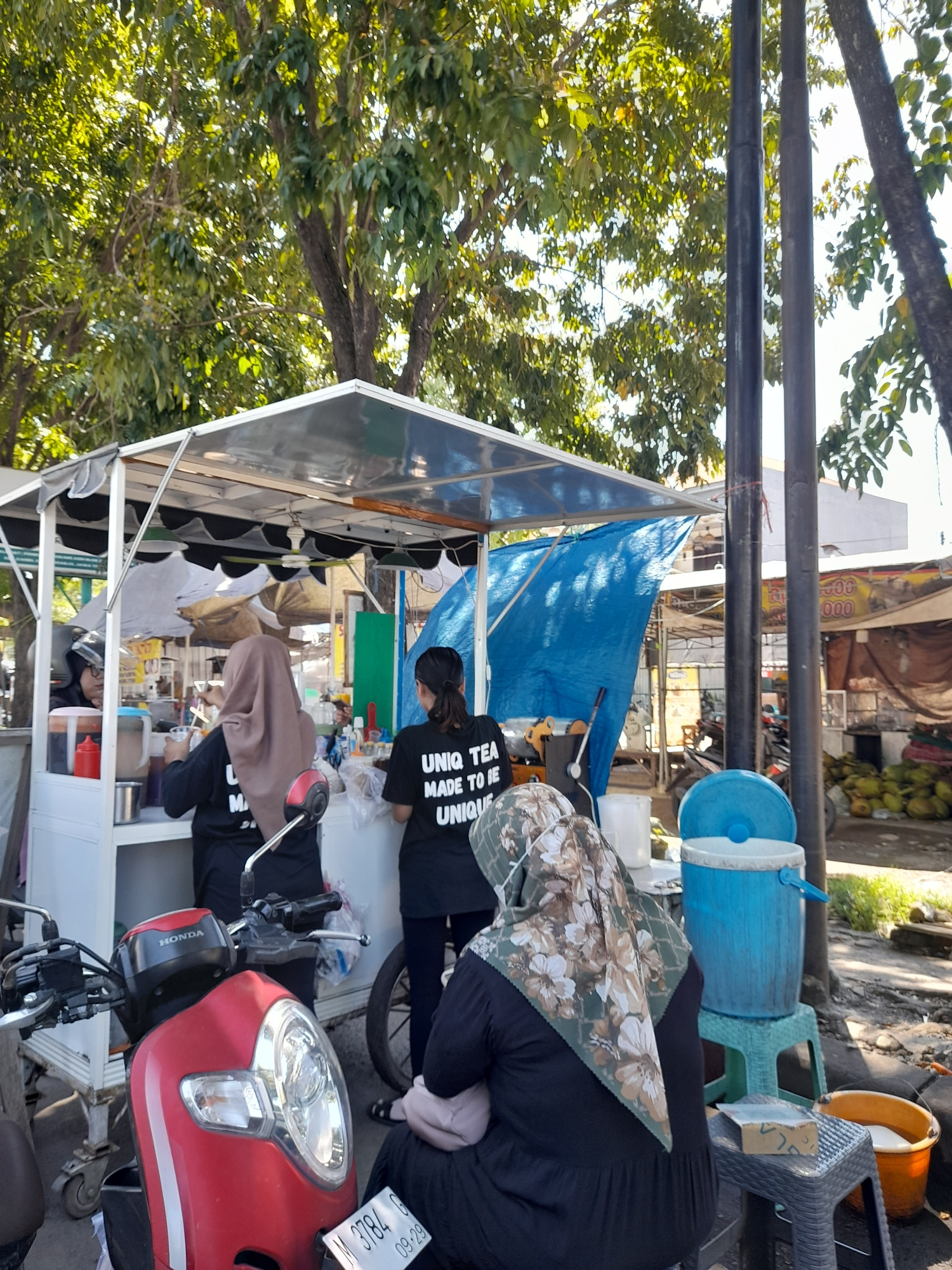 The image depicts a street-side beverage vending operation in Sumokali, Indonesia. Three individuals are working within a mobile cart structure covered by a blue tarp. One person is wearing a hijab wi…read more