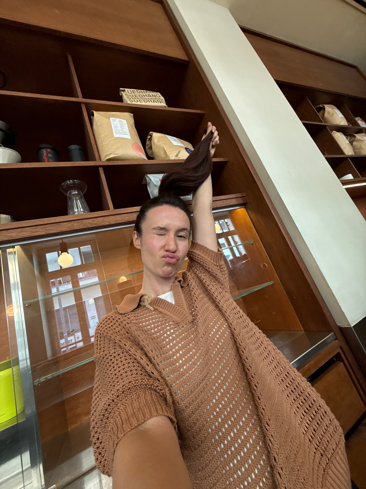 A woman is taking a selfie in a cafe, holding her ponytail up in the air. The woman has dark hair pulled back in a ponytail and is wearing a brown, knit sweater over a white shirt. She is making a kis…read more