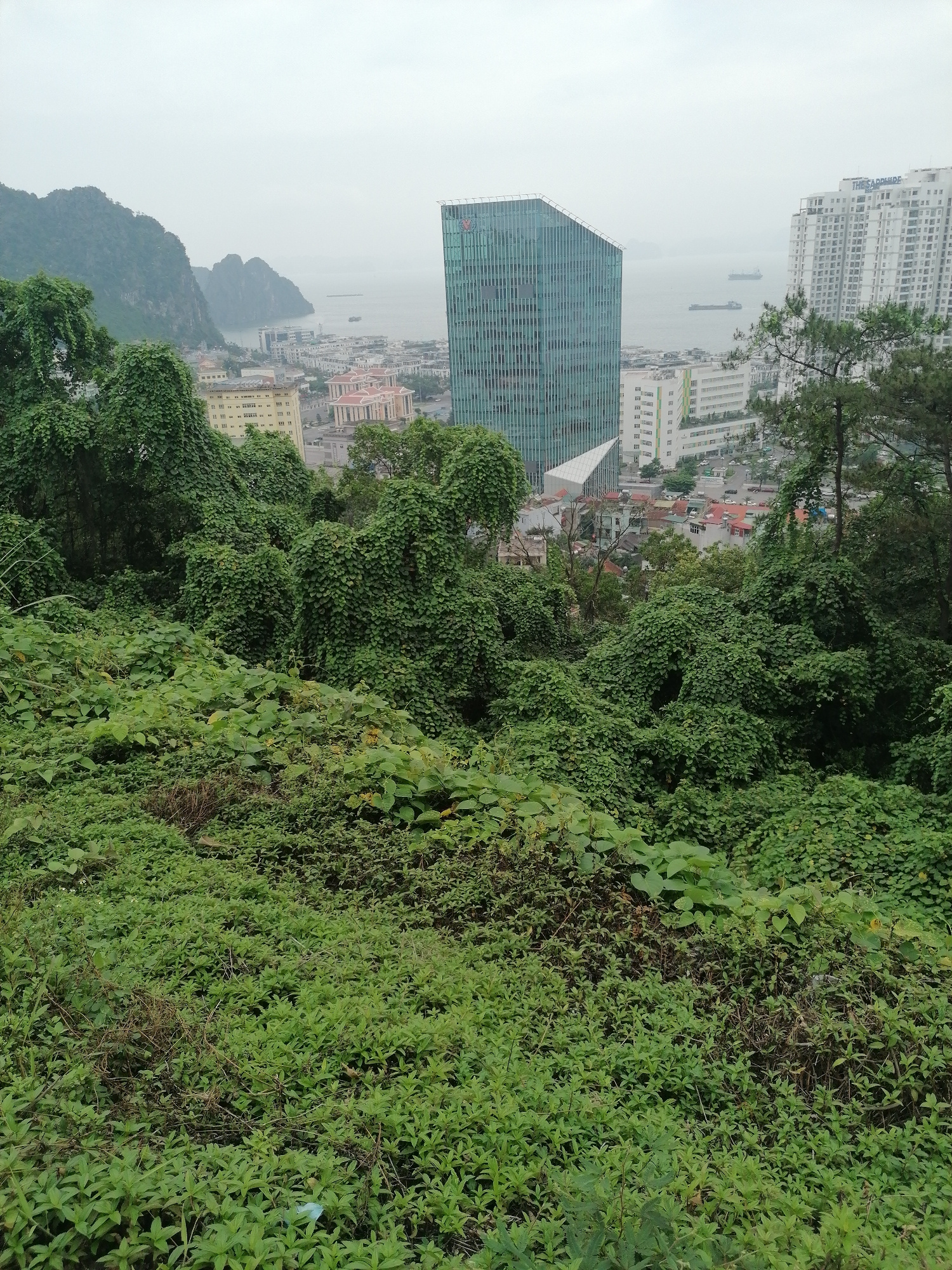The image shows an elevated view from an overgrown hillside in Hong Gai Ward, Vietnam. Dense vegetation covers the foreground and midground. Trees and bushes are heavily laden with vines. The cityscap…read more