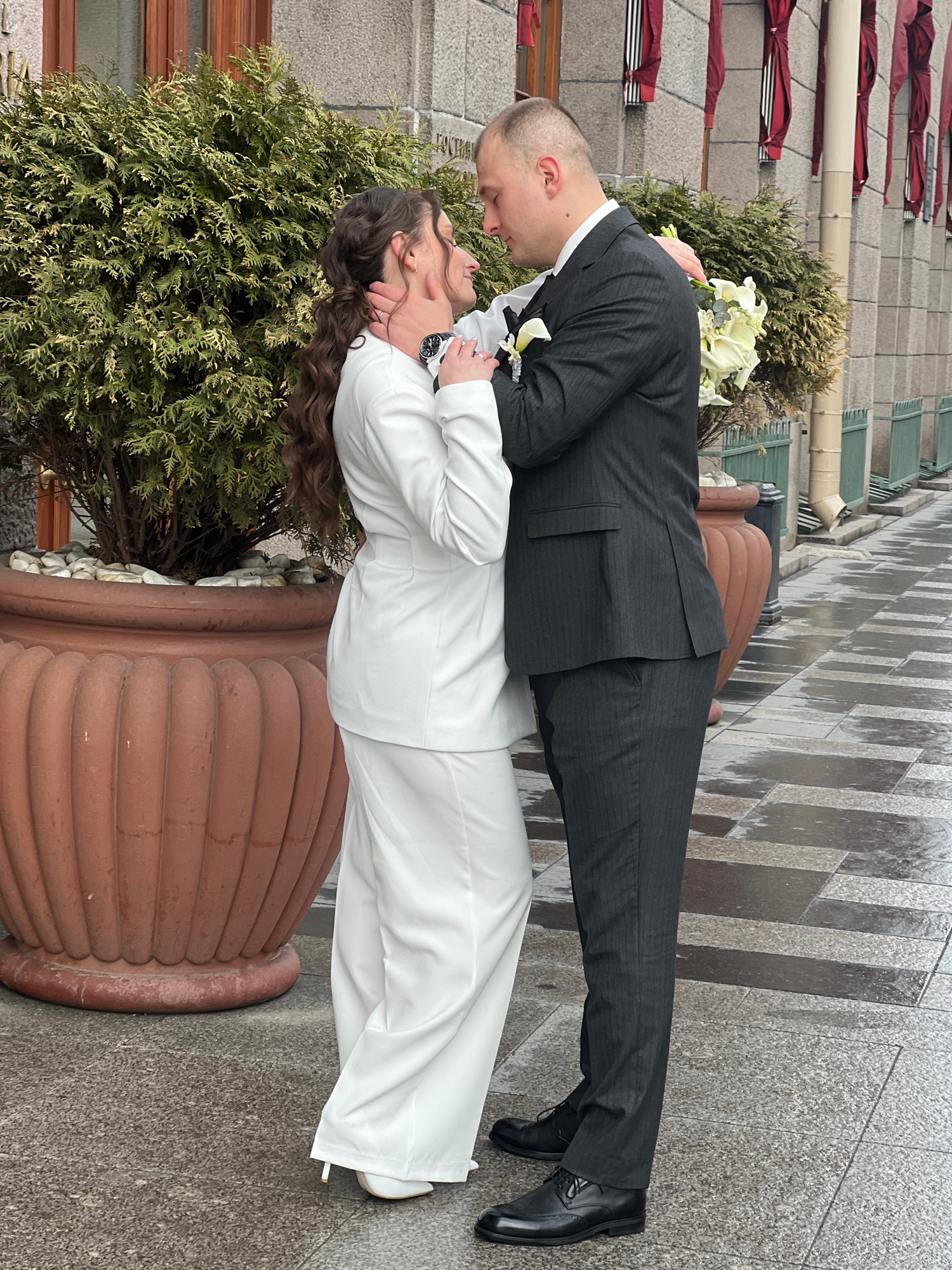 A man and a woman are embracing each other. The man is wearing a dark suit and the woman is wearing a white suit. They are positioned next to a large planter with shrubs in it. The scene is located onβ¦read more