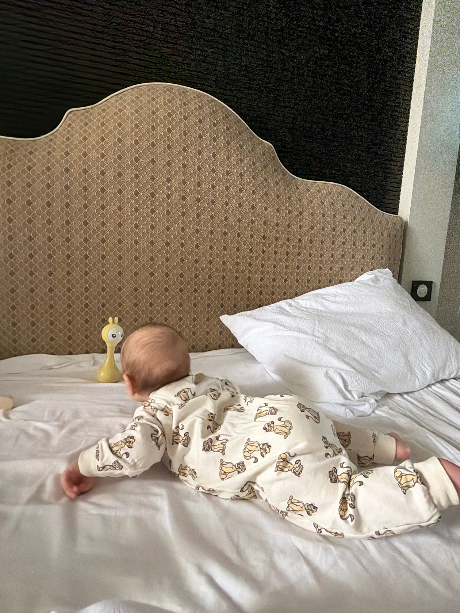 The image shows a baby lying on a white bed with a white pillow, next to a beige headboard with a scale pattern and a dark brown wall. The baby is wearing a white onesie with a "Lion King" print. A ye…read more