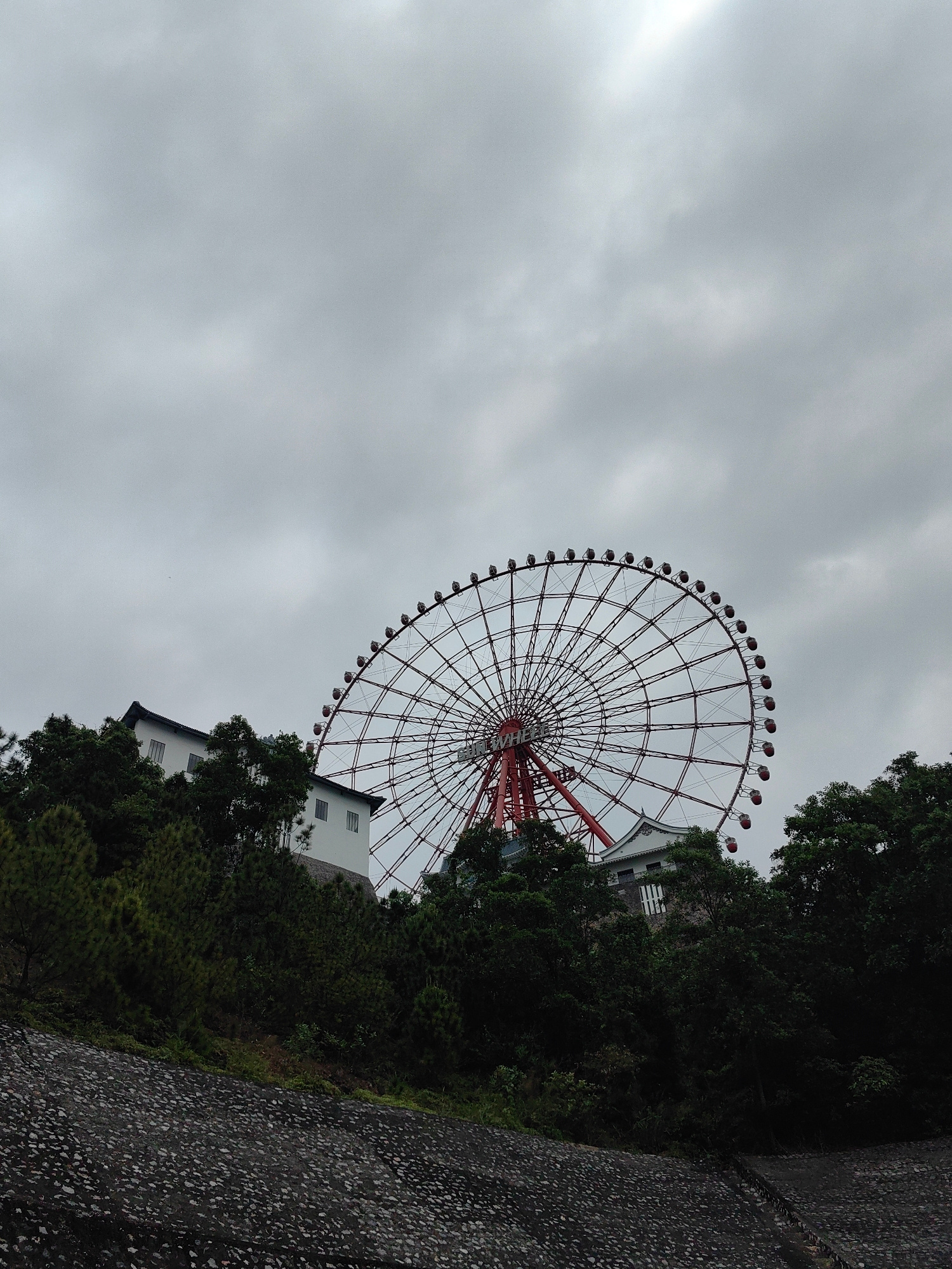 The image depicts a large Ferris wheel partially obscured by trees and a building on a hill in Hong Gai Ward, Vietnam. The sky is overcast with grey clouds. The Ferris wheel has a red frame and suppor…read more