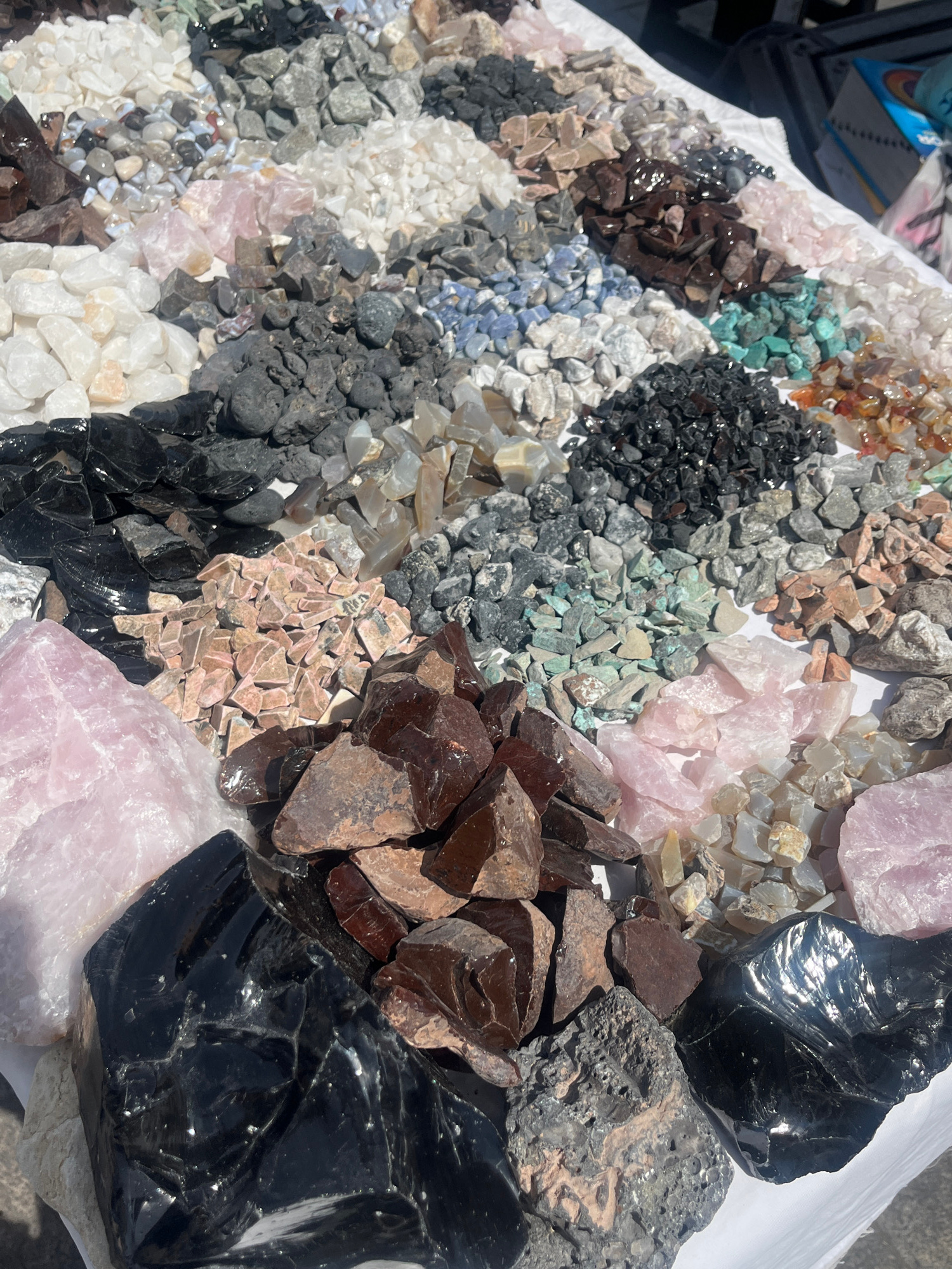The image shows a close-up, eye-level view of a variety of rocks and minerals displayed on a white surface, possibly a cloth or table. The scene is in a city named Unknown, Unknown. The collection inc…read more