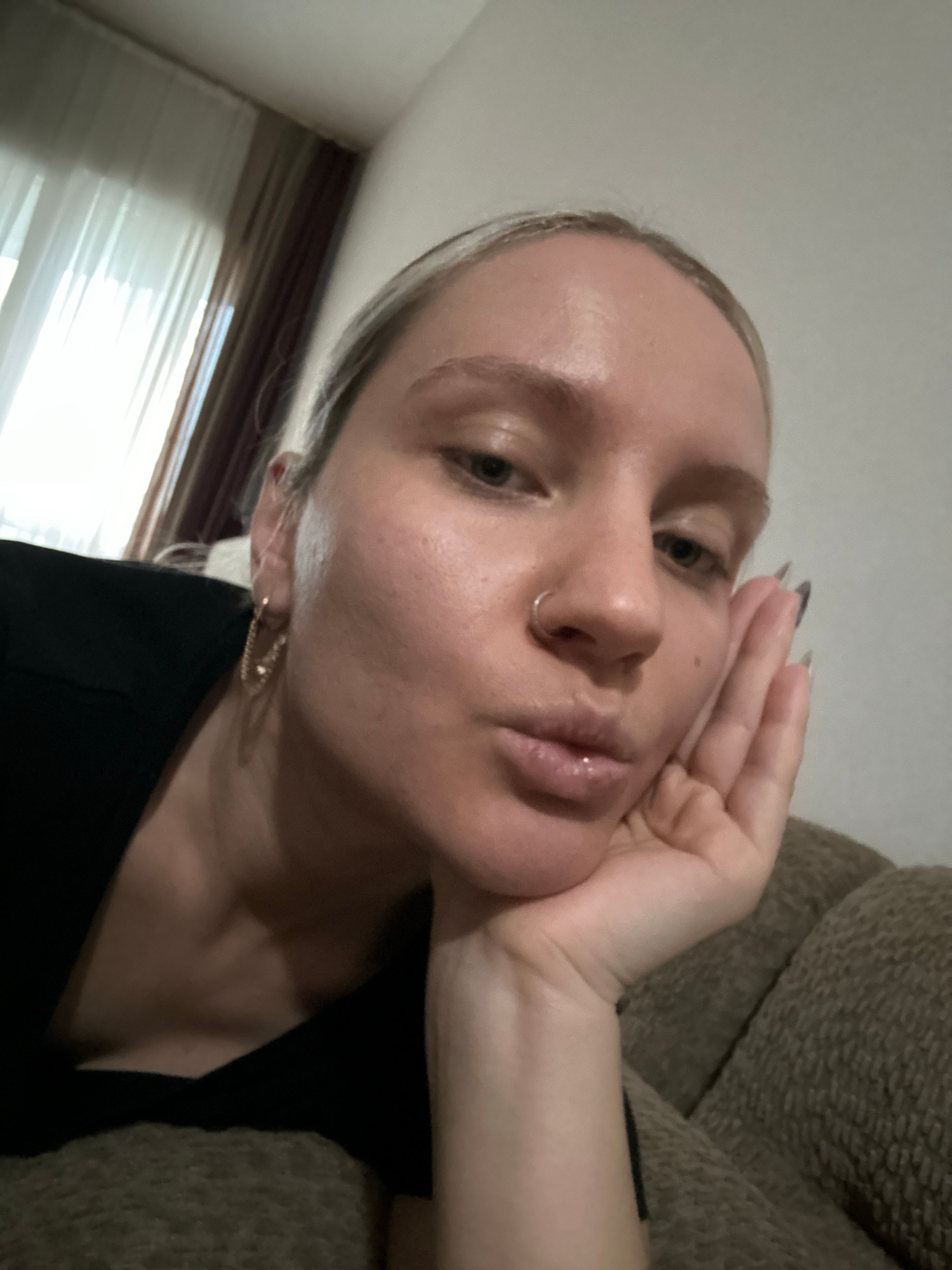 A fair-skinned young woman with blonde hair is lying on what appears to be a brown couch or sofa. She's wearing a black top. Her right hand is raised to her face. She has a ring in her nose. Behind heβ¦read more