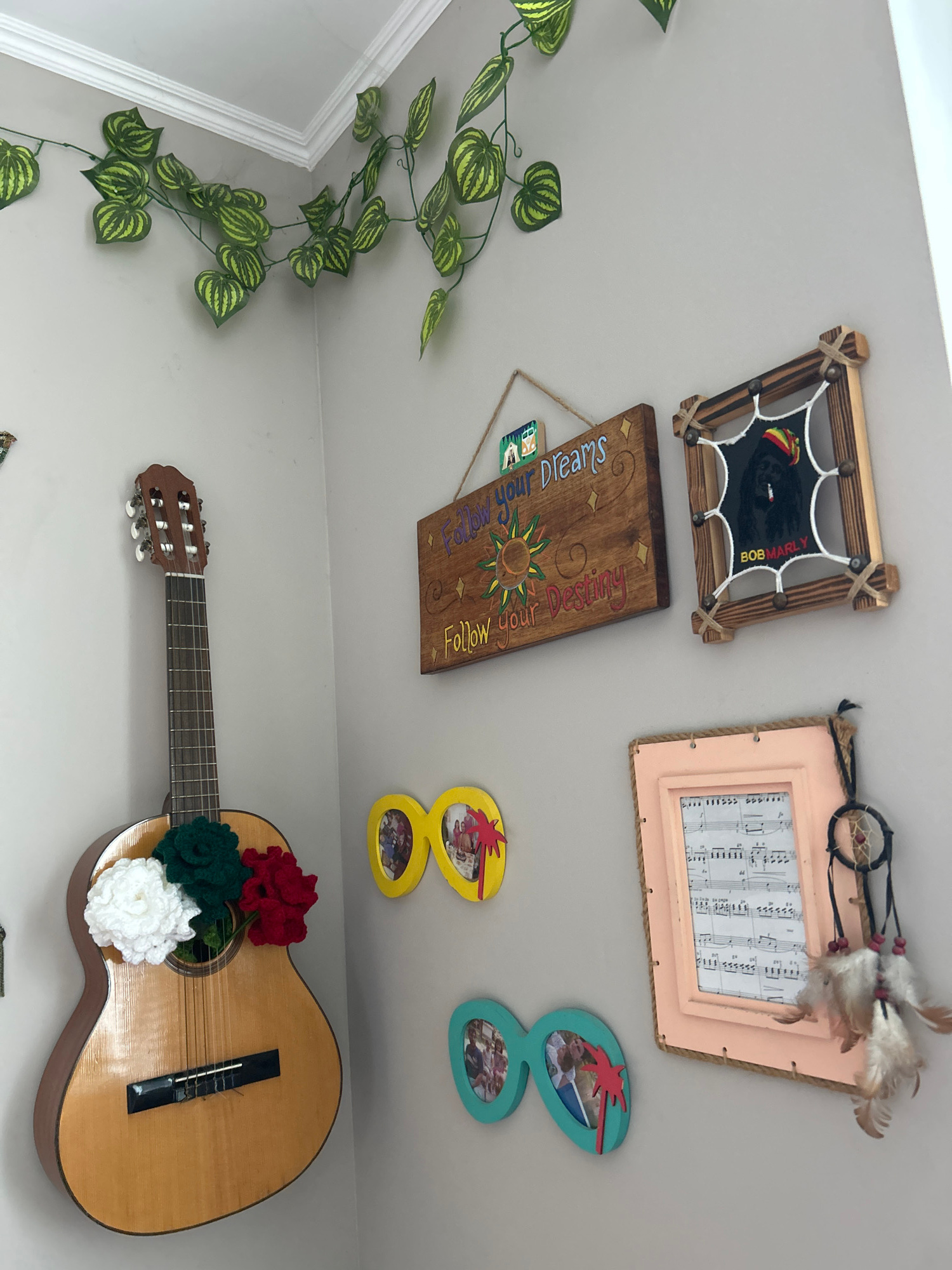 The image shows a wall with various decorations. A guitar with red, green, and white crocheted flowers is mounted on the wall. Above the guitar are two pairs of sunglasses-shaped picture frames, one y…read more