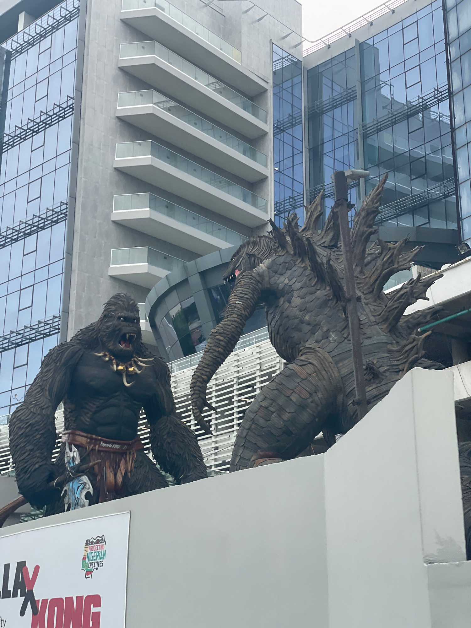 A large outdoor sculpture of Godzilla and King Kong is displayed in front of modern buildings in Itirin, Nigeria. The buildings feature glass and concrete construction. The sculptures are brown and ap…read more