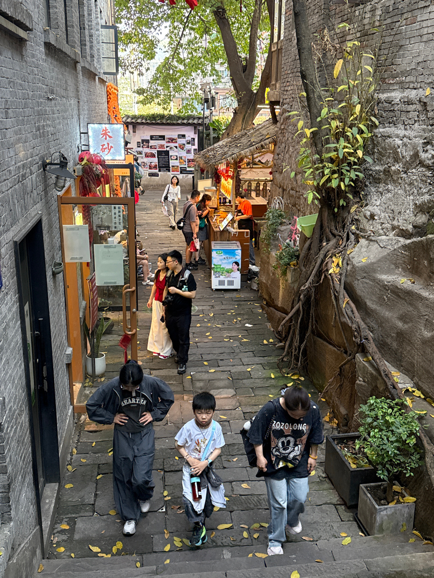 This image depicts a bustling outdoor alleyway or pedestrian street in Yuzhong District, China, characterized by its historical and natural elements. The ground is paved with grey stone bricks, scatte…read more