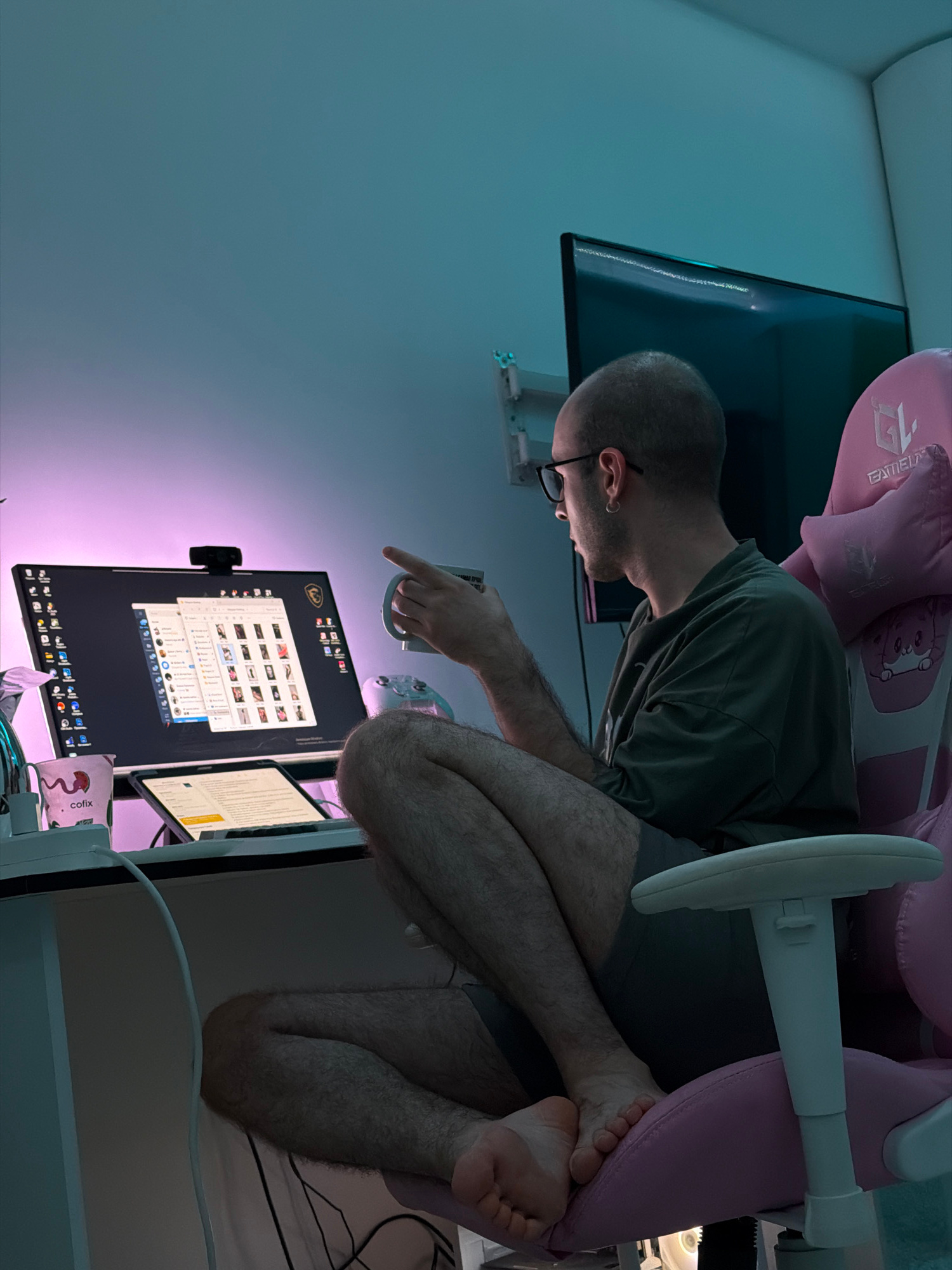 A man with glasses is sitting cross-legged in a pink gaming chair, facing two computer monitors. He is holding a white mug in his right hand, pointing towards the monitors. The monitor on the left dis…read more