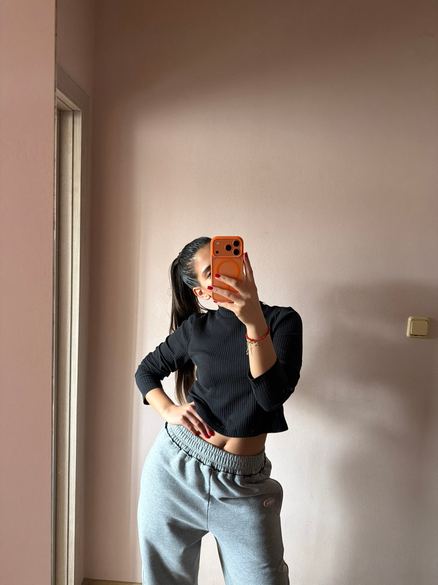 A woman is taking a selfie in a room. She is wearing a black long-sleeved shirt and grey sweatpants. She is holding an orange smartphone. The room has light pink walls and a light switch is visible ne…read more