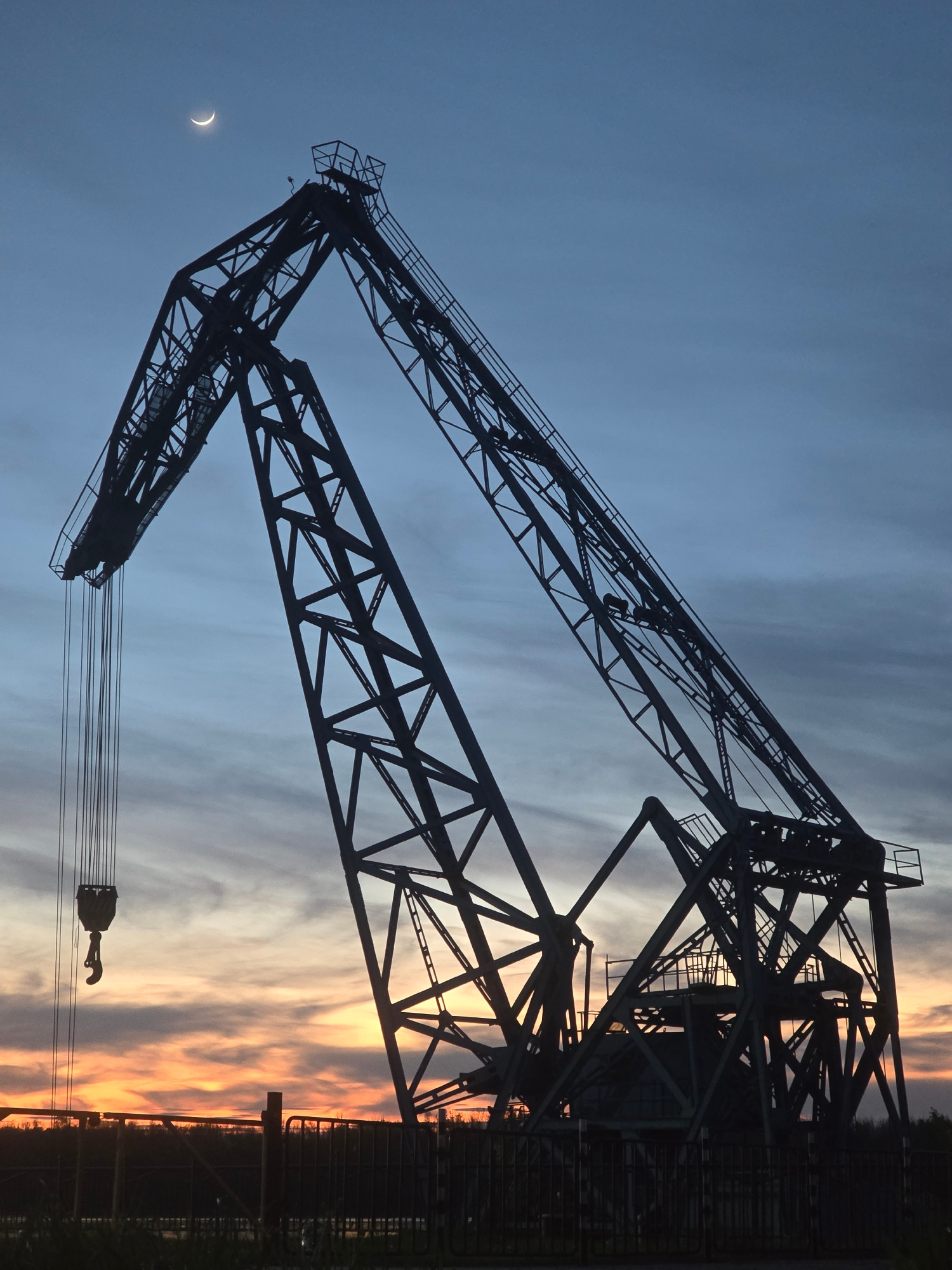A long-angle shot looking up at the silhouette of a large, metal crane. The crane has an angled boom and a complex structural design. A crescent moon is visible in the lower left corner, set against a…read more