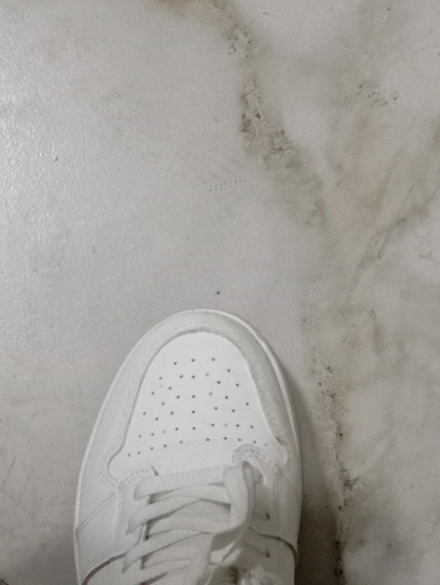 A single white sneaker is positioned on a light-colored, patterned surface. The sneaker's toe box, laces, and a portion of its side are visible. The background surface appears to be a type of tile or…read more