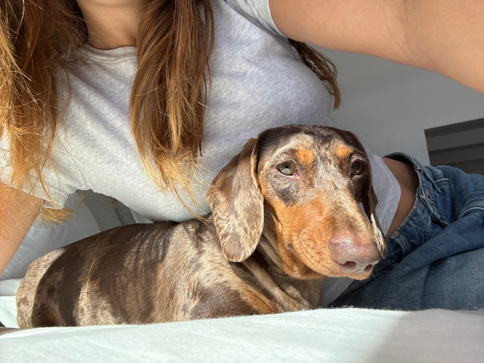 A brindle dachshund lies on a person wearing a gray t-shirt. The dog is positioned head-upwards relative to the viewer, gazing forward with light brown eyes and floppy ears. The dog's body stretches a…read more
