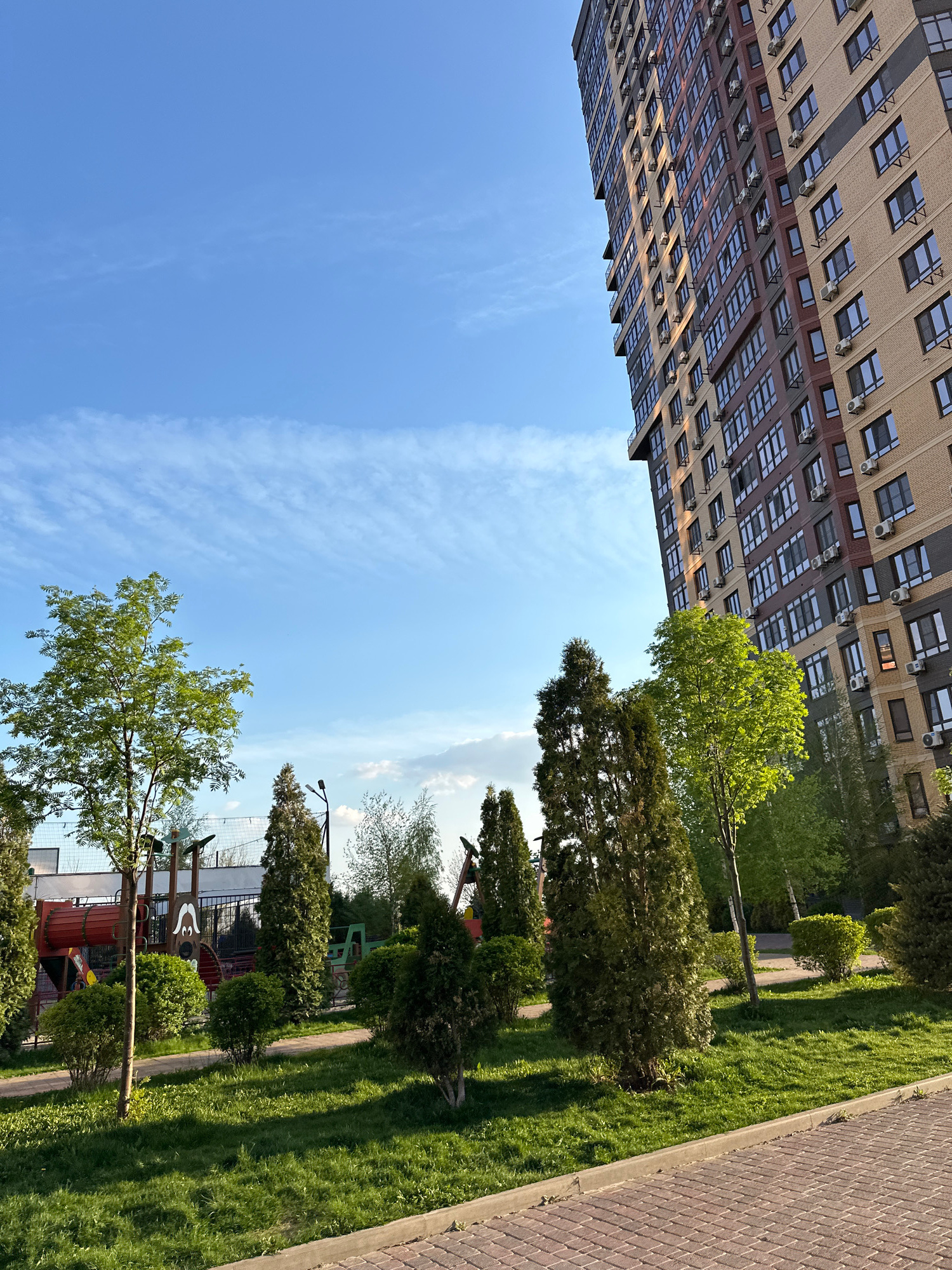 The image presents an upward view of a modern urban scene, likely in a residential area of Rostov-on-Don, Russia. A tall, multi-story building dominates the upper left of the frame. It features a grid…read more