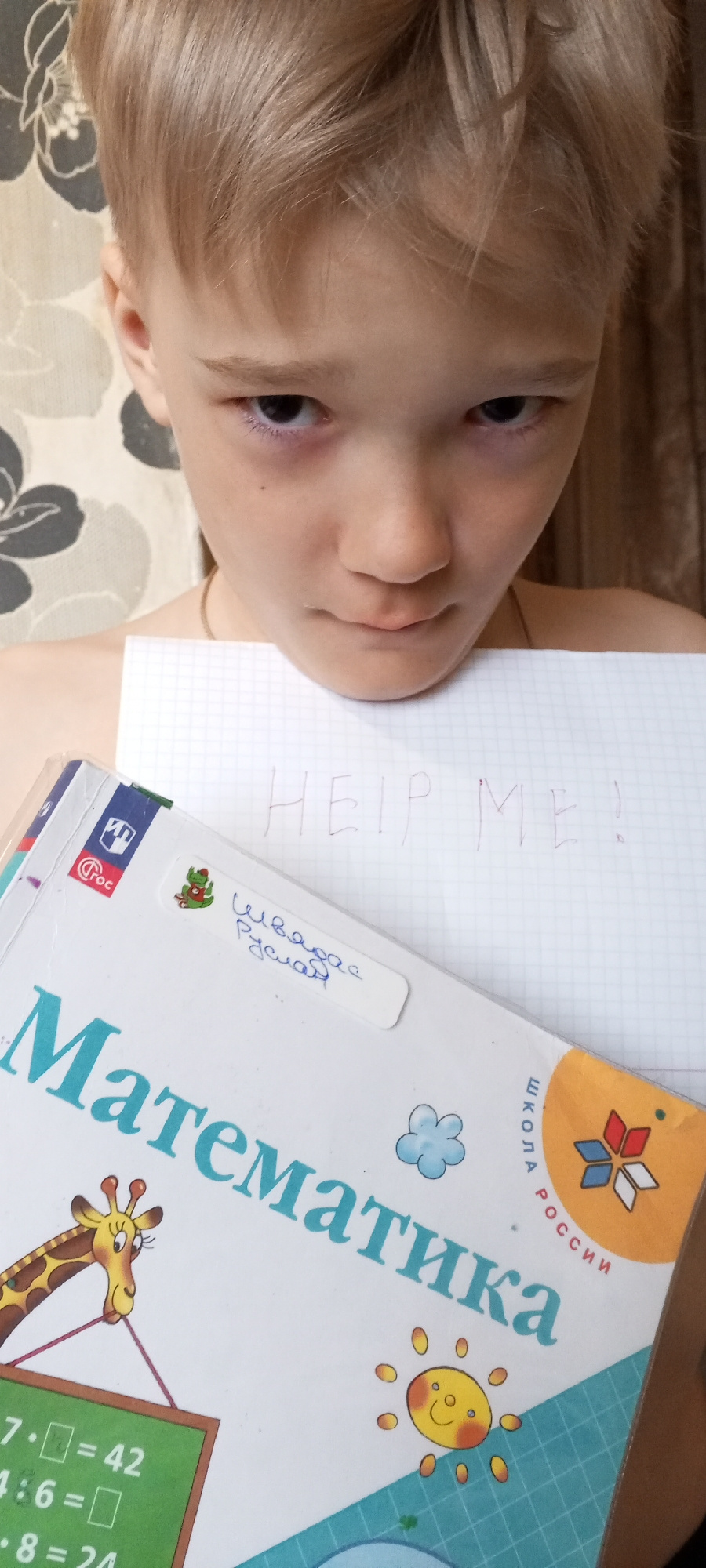 A young boy with light blond hair and a serious expression looks directly at the camera in a close-up, chest-up shot. He is holding a piece of graph paper in front of him, on which "HELP ME!" is writt…read more
