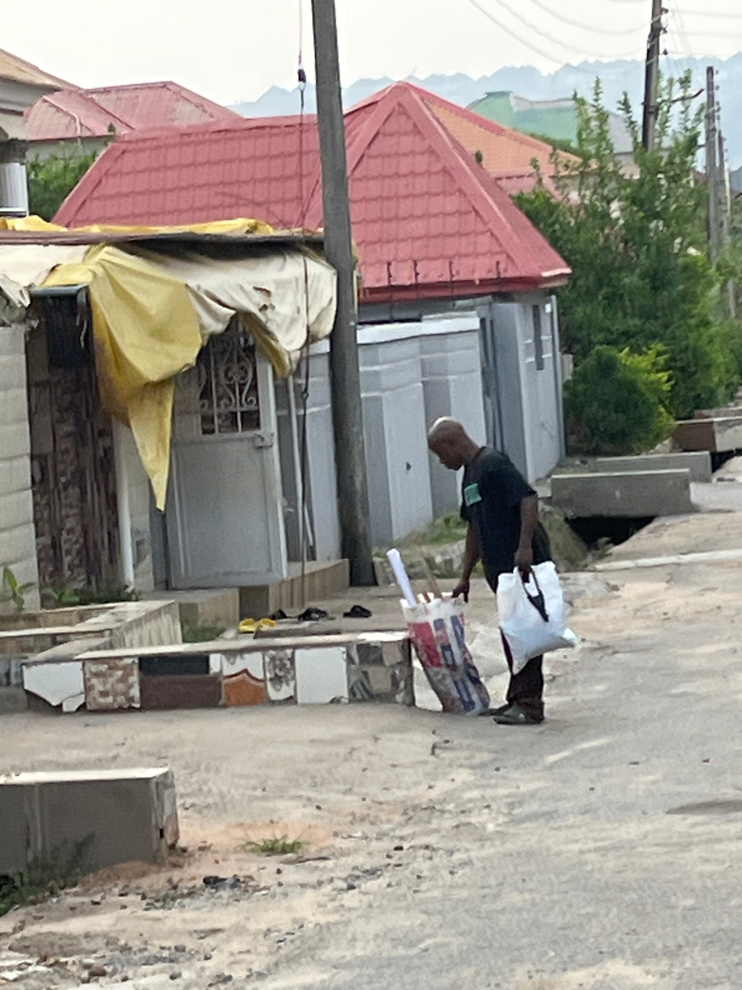 A man wearing a black t-shirt and light-colored shorts is bending over while standing on a street or sidewalk. He appears to be holding or placing something on a low wall or structure constructed from…read more