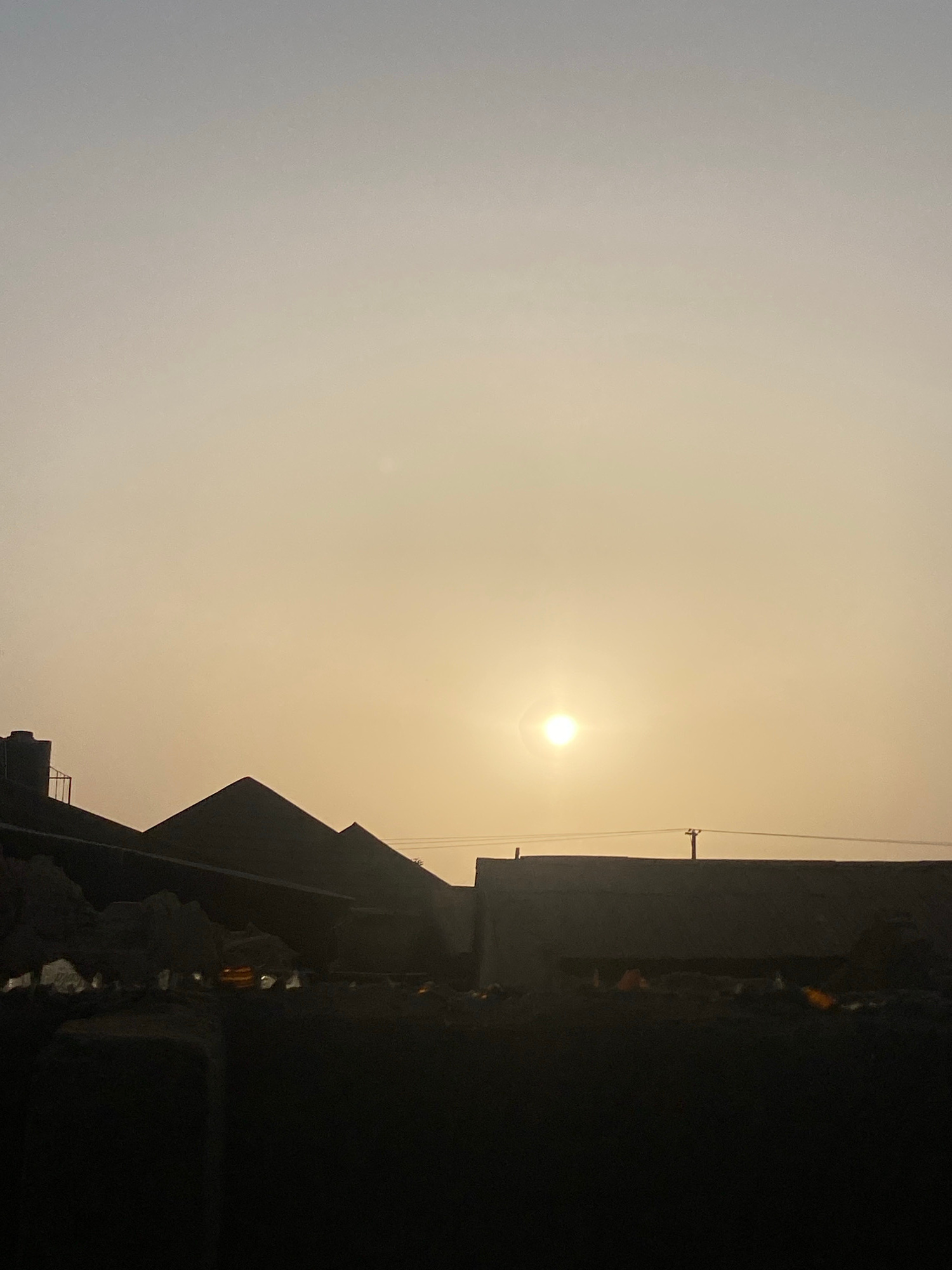 The image shows a bright sun in a hazy, light yellow sky. To the right are silhouettes of buildings. The photograph was taken in Narayi, Nigeria.