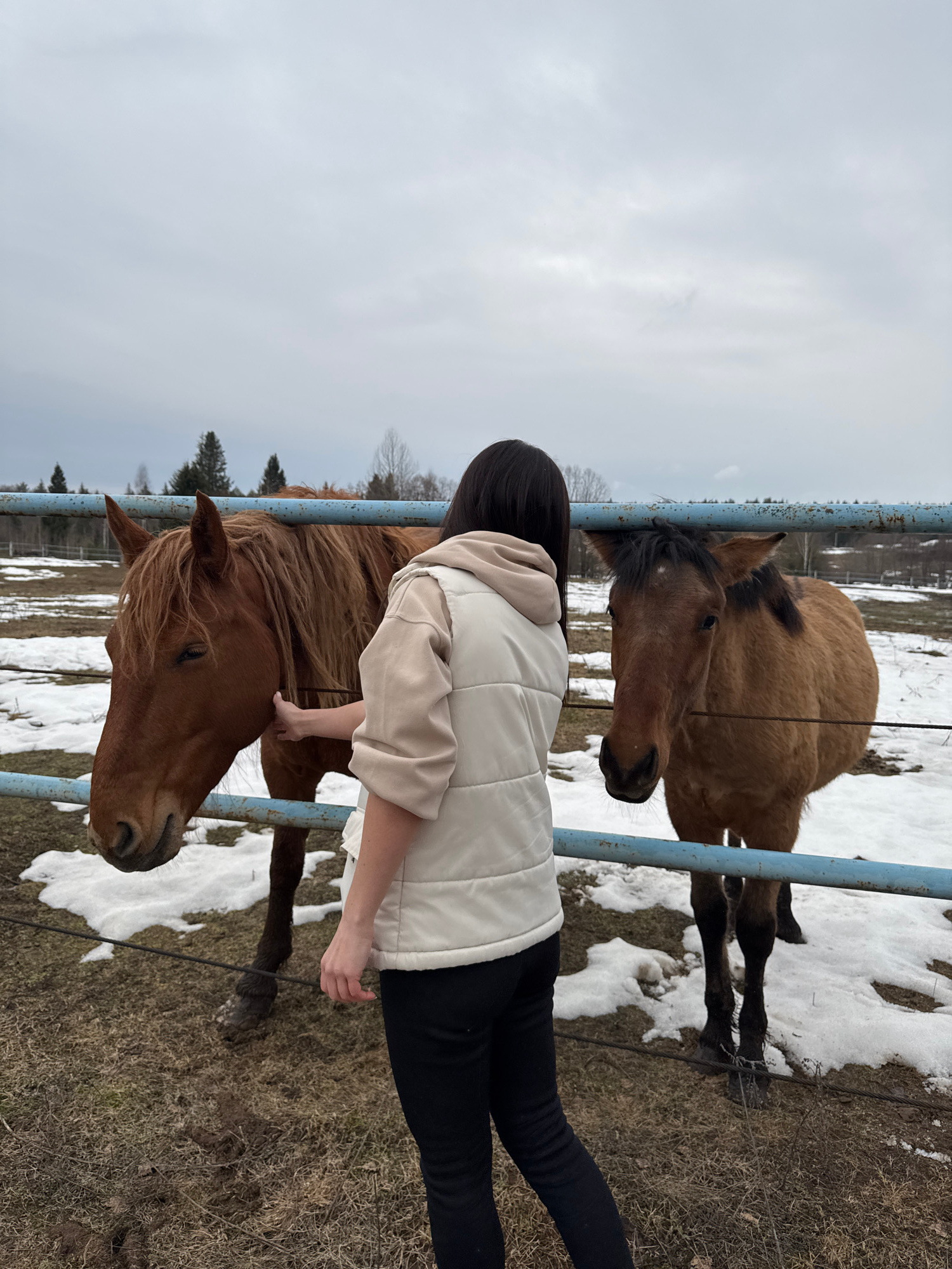 A person is interacting with two brown horses inside a blue metal fence in Opary, Russia. The ground is partially covered with snow. The sky is overcast. The person is wearing black leggings and a ligβ¦read more
