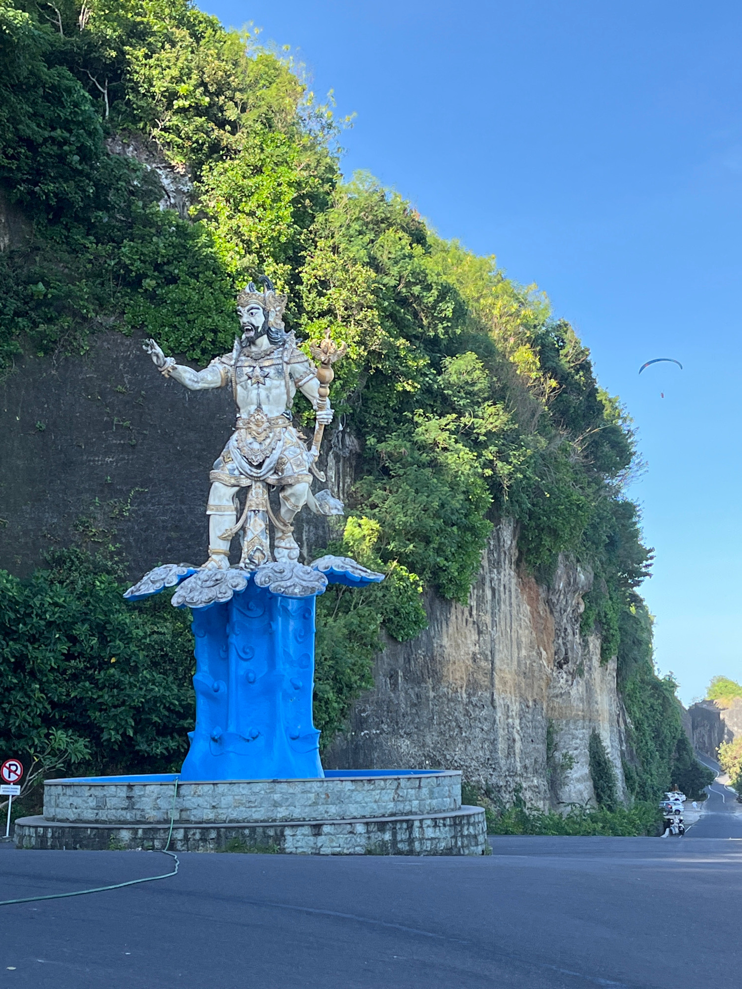The image shows a statue of an Indonesian deity in Kuta Selatan, Indonesia. The statue is white and stands on a blue pedestal adorned with cloud-like designs. The statue is positioned in front of a cl…read more