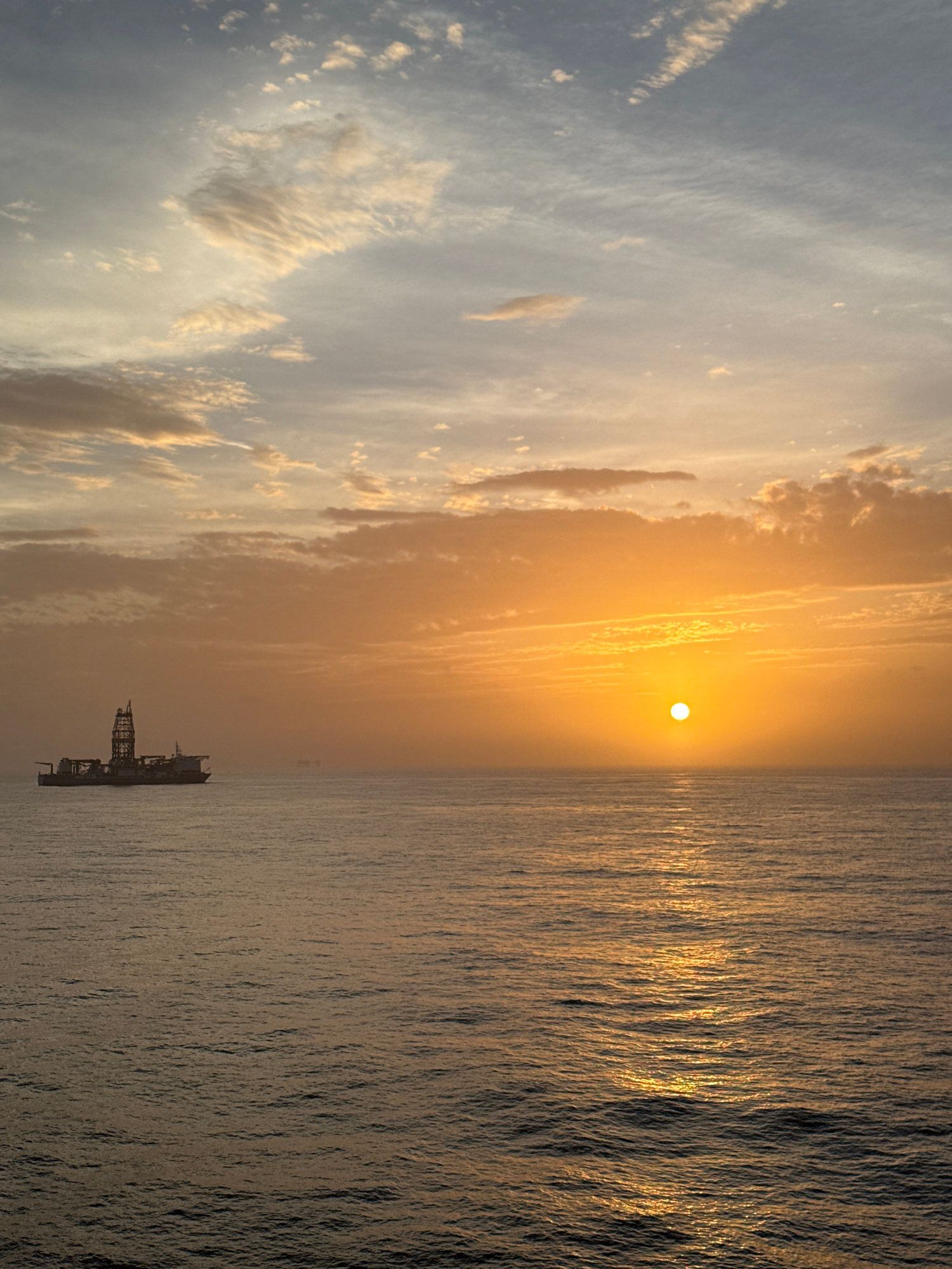 The image depicts a seascape at sunset. The sun, a bright circular orb, is positioned centrally in the frame, casting a golden light across the water. The sky is a mix of blue and golden hues, with cl…read more