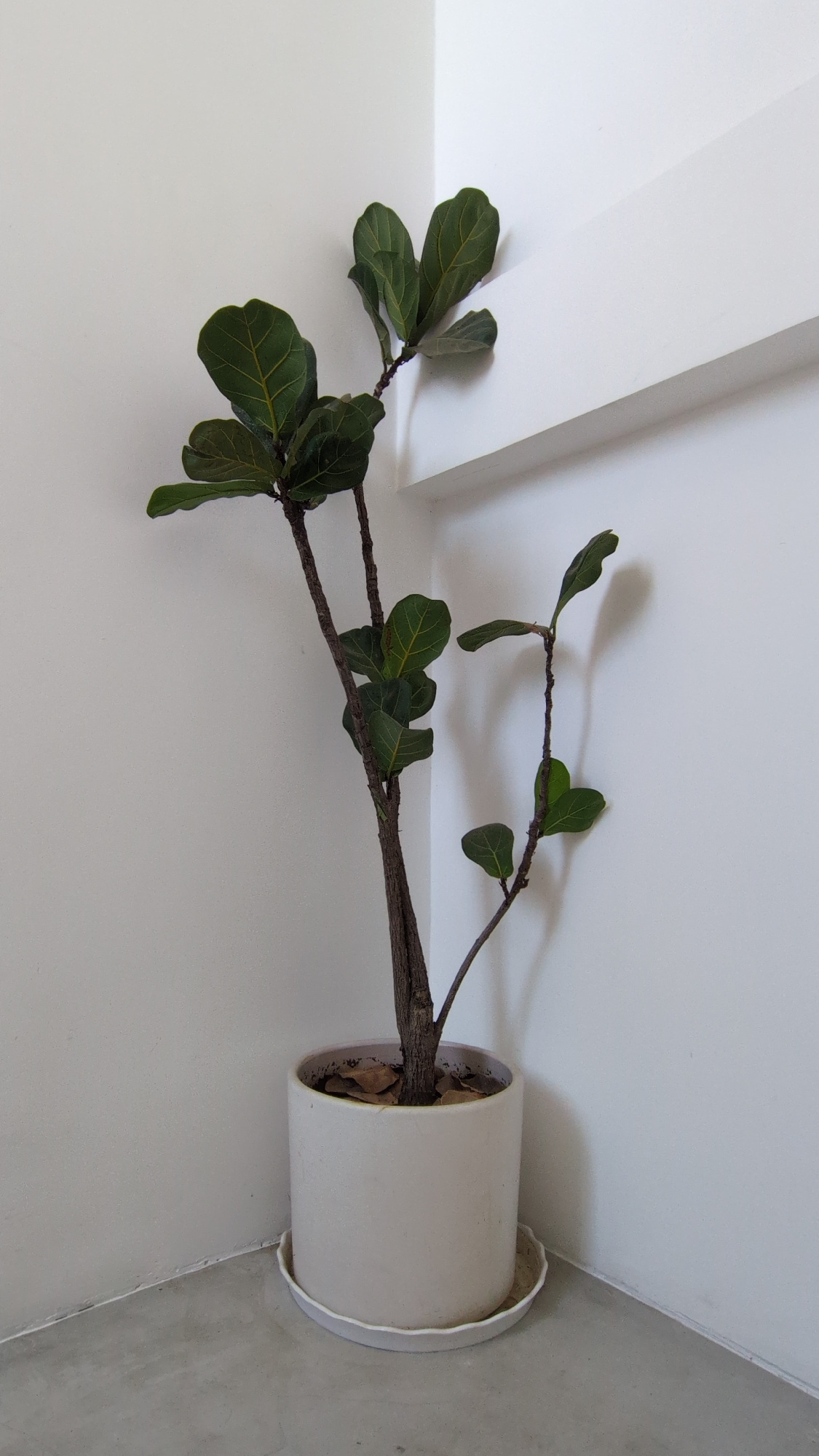 A potted fiddle-leaf fig plant is situated in the corner of a room, likely indoors. The plant is in a cylindrical white pot with a saucer underneath. The walls are white, and the floor appears to be a…read more