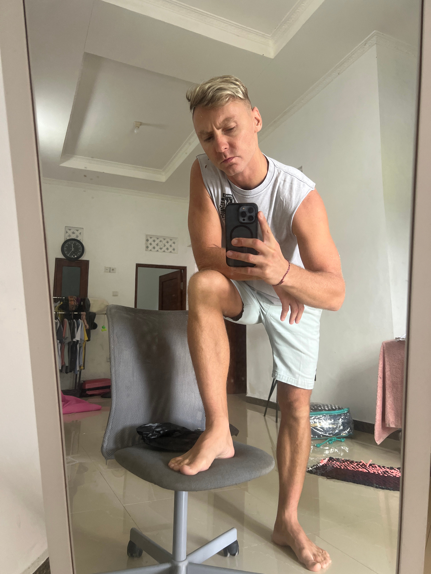 A male is taking a mirrored selfie in an indoor setting, seemingly in a room within a residence in Sukawati, Indonesia. He is dressed in a light-colored tank top and shorts, holding a smartphone. The…read more