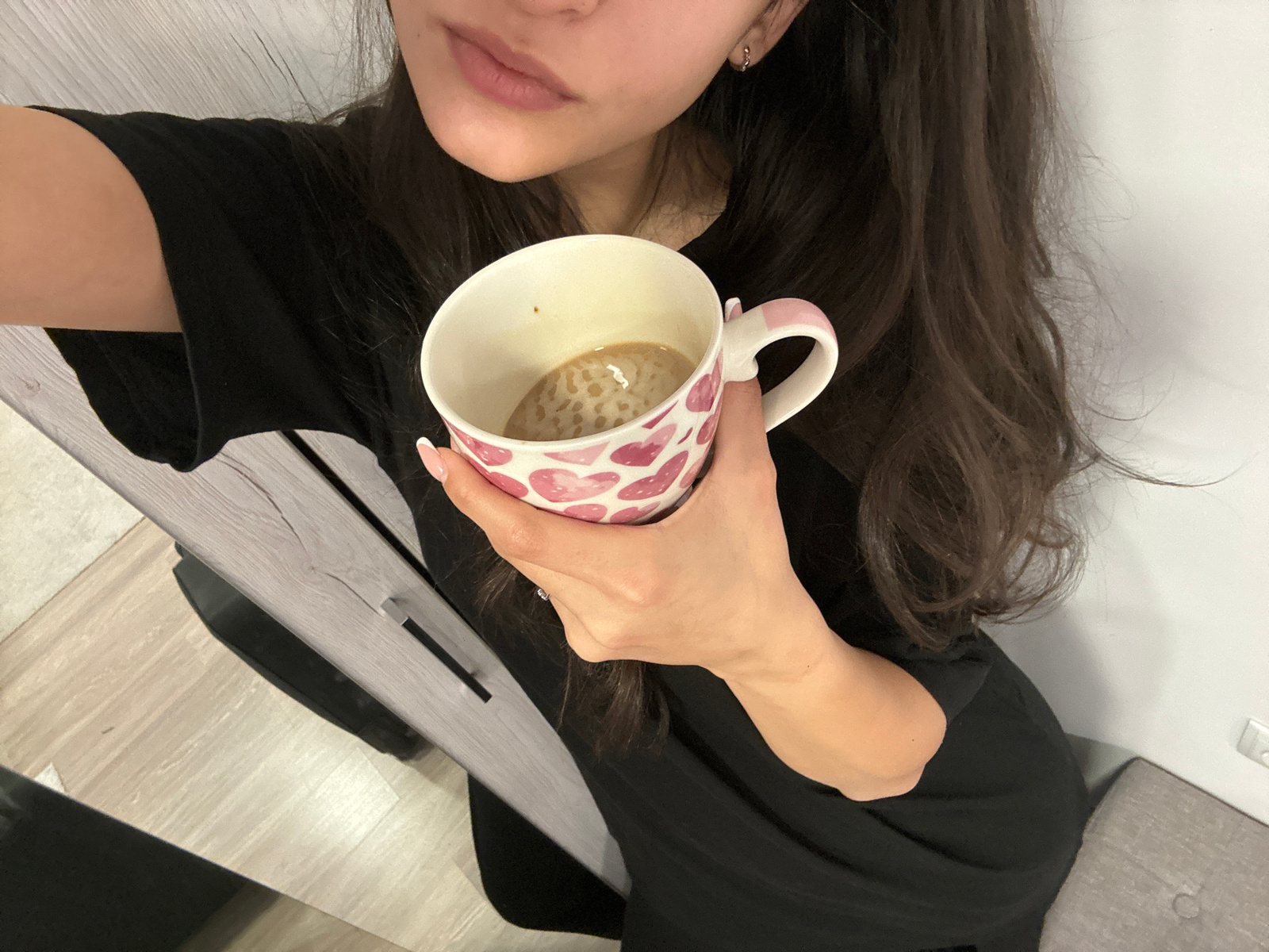 A woman is holding a mug with a pink heart pattern, containing a light-colored liquid, near her face. She has long brown hair and light skin. She is wearing a black garment. She is sitting on a gray u…read more