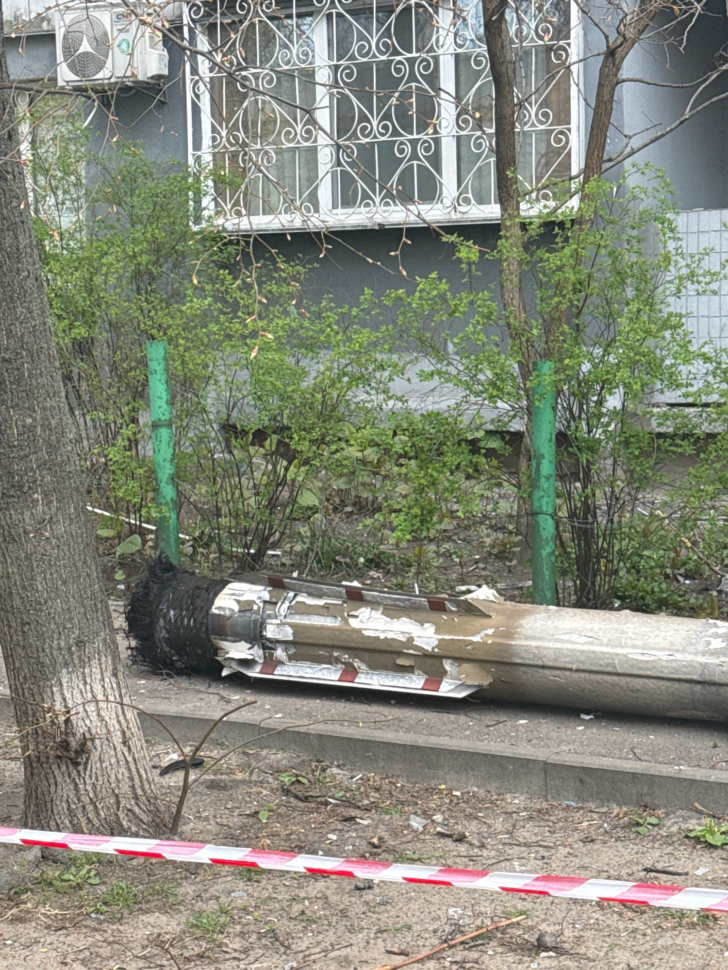 The image shows what appears to be the remains of a missile lying on the ground, close to a curb. It has a cylindrical shape with damaged white and red markings. There is black debris surrounding the…read more